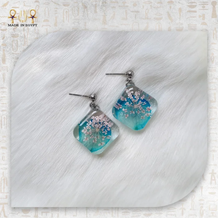 يتميز الحلق بتصميمه المربع ذي الحواف المستديرة الذي يمنحه طابعًا عصريًا وأنيقًا في الوقت نفسه. كل قطعة تُصنع يدويًا بعناية فائقة، مما يجعل كل زوج من الحلقان فريدًا لا يتكرر، فترتيب الأزهار داخل الريزن يختلف في كل قطعة، ليمنحها لمسة من التفرد والتميز.