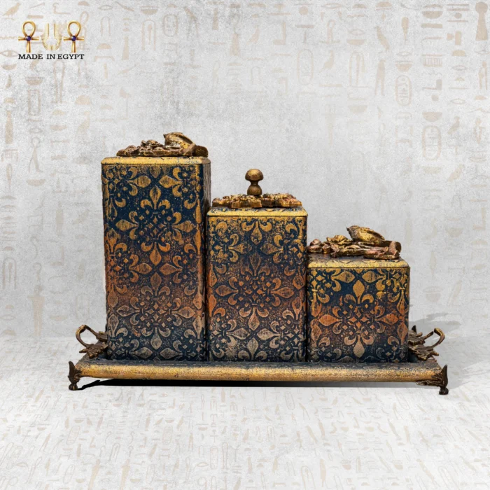كل قطعة من هذا الطقم صُنعت يدويًا بأيدي حرفيين مصريين محترفين. التفاصيل الذهبية تلتقي بالنقوش الزرقاء في انسجام يعكس الفخامة الملكية، بينما يضيف الملمس المحفور عمقًا ولمسة من الدفء. كما يعكس الطقم روح الطبيعة المصرية التي تجمع بين صفاء السماء ولمعان الرمال الذهبية، مما يمنح المكان طاقة إيجابية وجمالاً لا يزول مع الزمن.