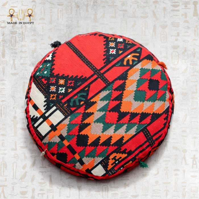**مقعد رمسيس** هو بوف أرضي مصنوع يدويًا من قماش الكليم المصري الأصيل، يتميز بنقوش هندسية ملونة تجمع بين الأحمر، الأخضر، البرتقالي، والأزرق لتمنح تصميمه طابعًا تراثيًا فخمًا. محشو بقطن ناعم يمنحه راحة وثباتًا في الشكل، ومزين بشرّابات أنيقة تضيف لمسة من الجمال اليدوي. مثالي للمجالس العربية أو زوايا الجلوس المنزلية، فهو يجمع بين الأصالة والراحة ليضفي دفئًا وأناقة على أي مساحة.