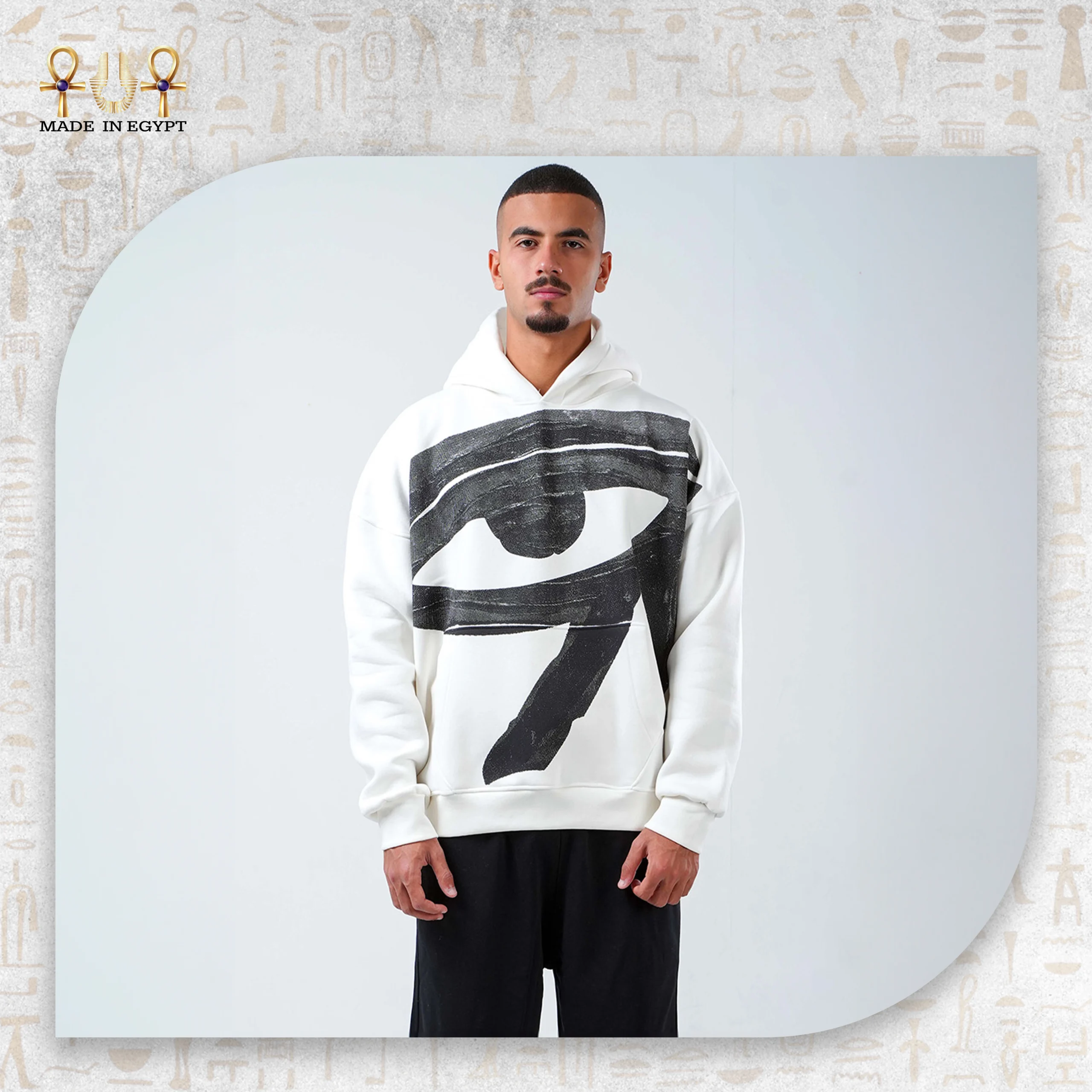 يتوسط التصميم رسم يدوي لرمز عين رع باللون الأسود على خلفية عاجية ناعمة. يرمز هذا الرمز إلى القوة والحماية والبصيرة كما كان يُعتقد في الحضارة المصرية القديمة. بالإضافة إلى ذلك، يعكس التصميم شخصية مرتديه ويحوّل القطعة إلى رمز شخصي للطاقة والثقة.