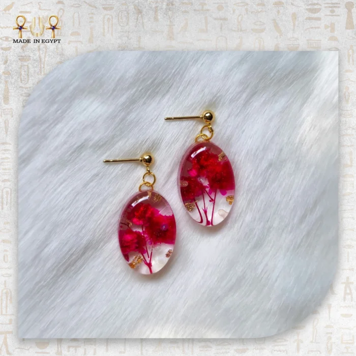 يتميز هذا التصميم بجماله الفريد الذي يجعله قطعة مميزة لا تتكرر، فكل وردة داخل الريزن لها شكلها وتفاصيلها الخاصة، مما يجعل كل زوج من الأقراط فريدًا من نوعه. اللمسة الذهبية داخل التصميم تضيف بريقًا أنثويًا جذابًا يعكس الضوء بشكل راقٍ مع كل حركة.