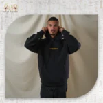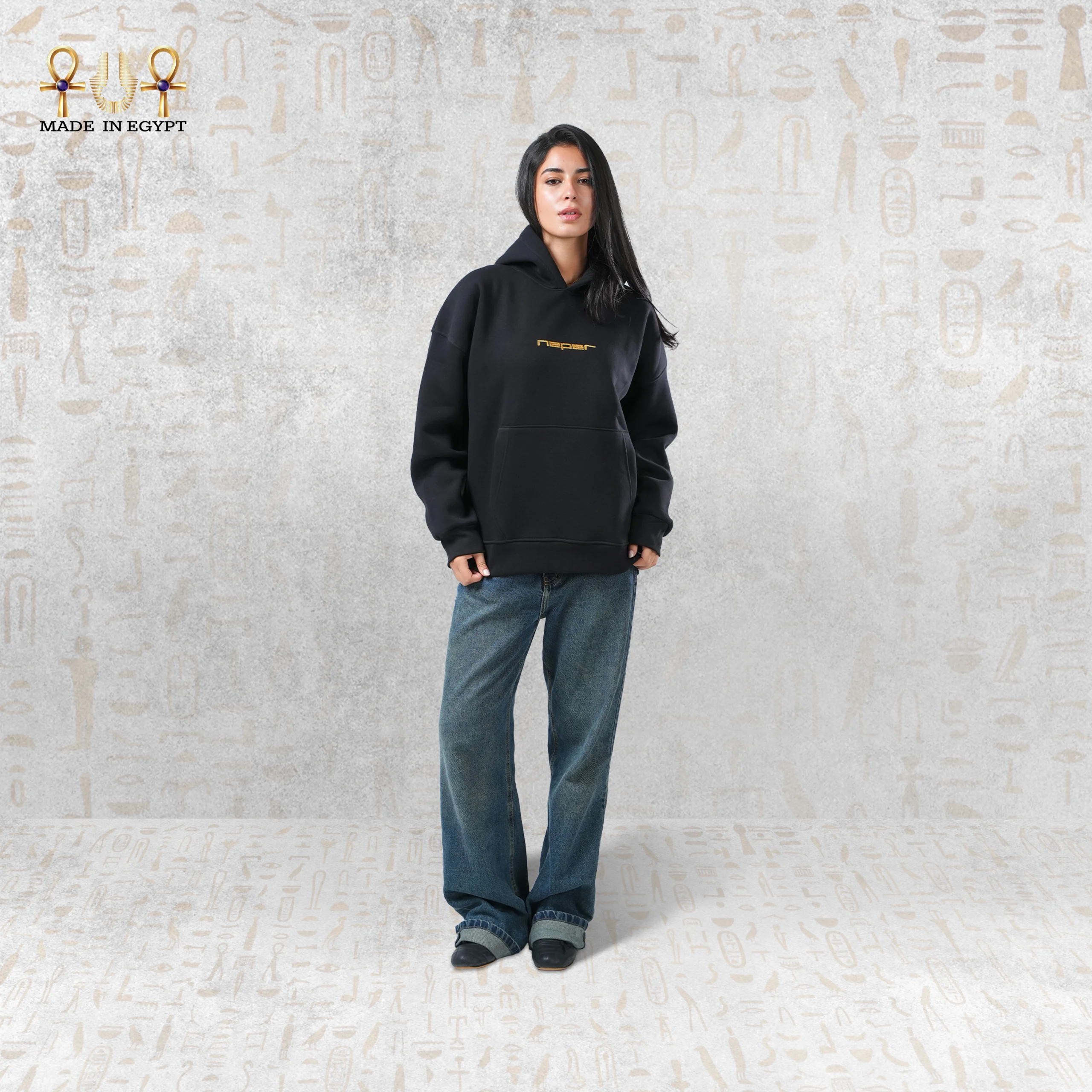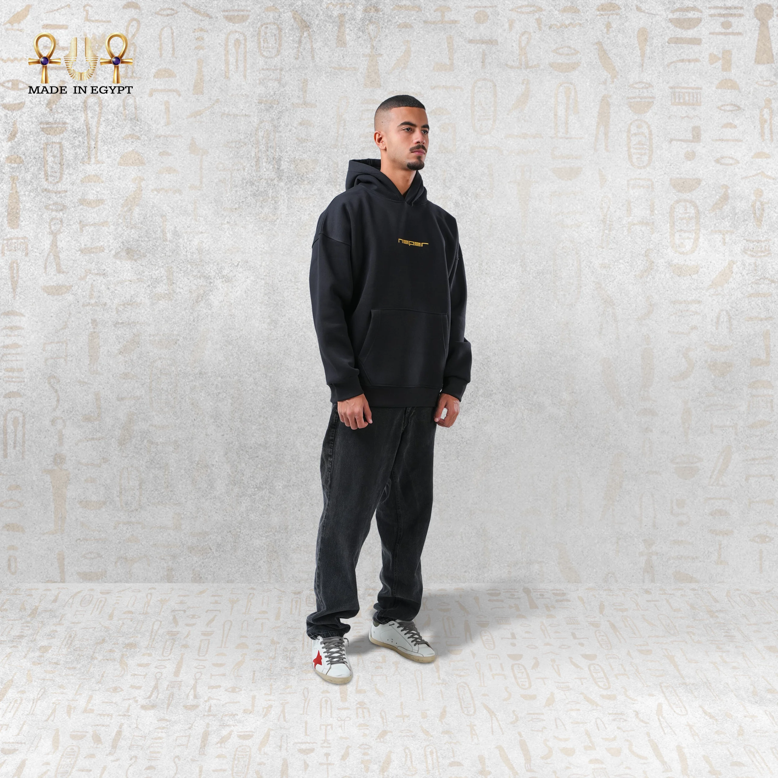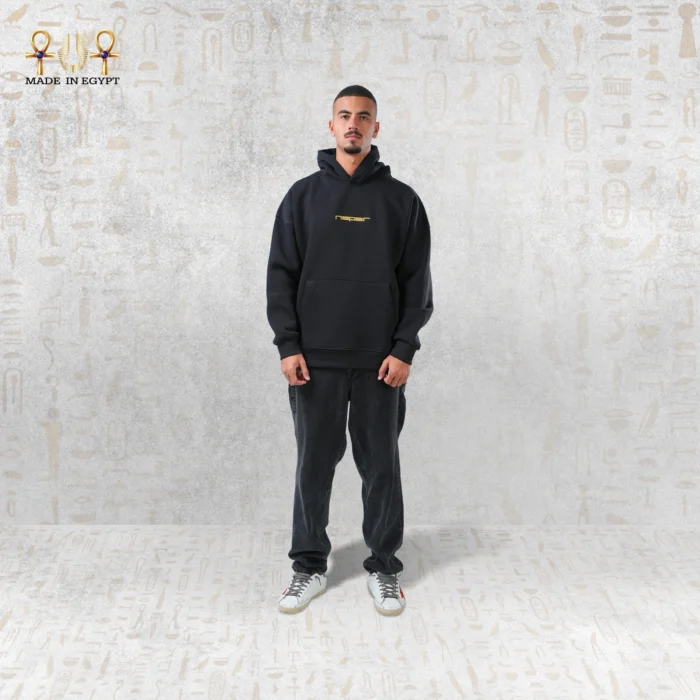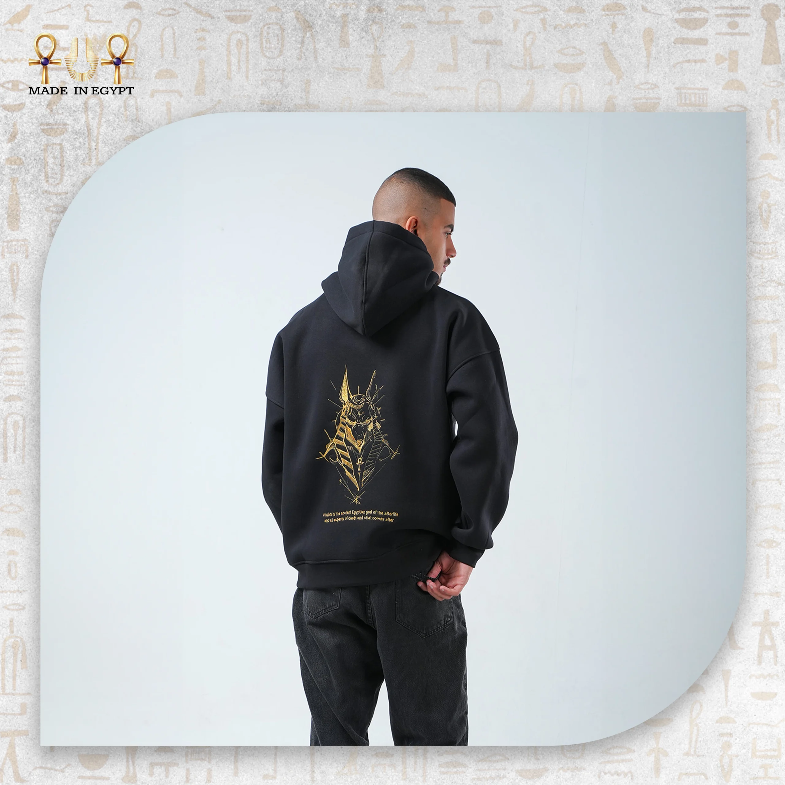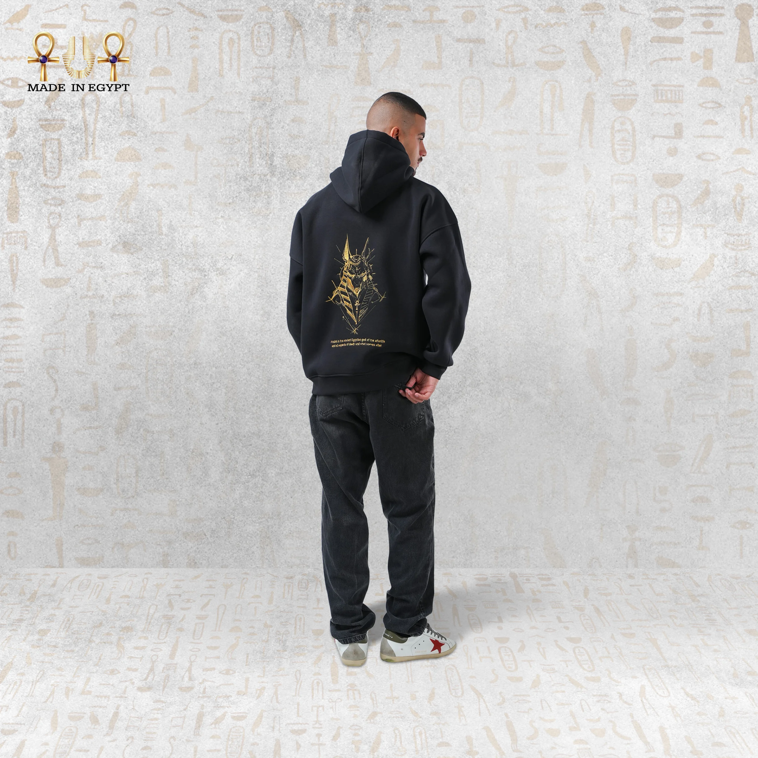 هودي أنوبيس جارديان يجسد القوة والحماية بتصميم مستوحى من الإله المصري أنوبيس، مصنوع من قطن ثقيل 100% باللون الأسود مع لمسات ذهبية فاخرة.