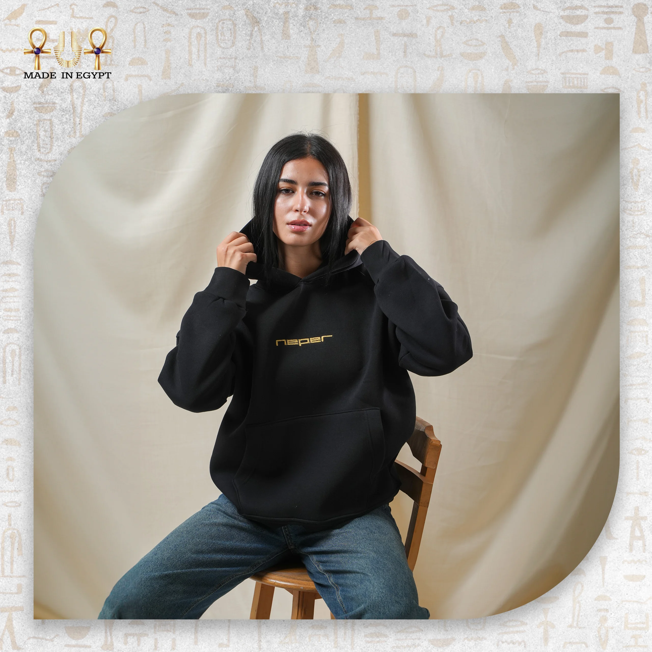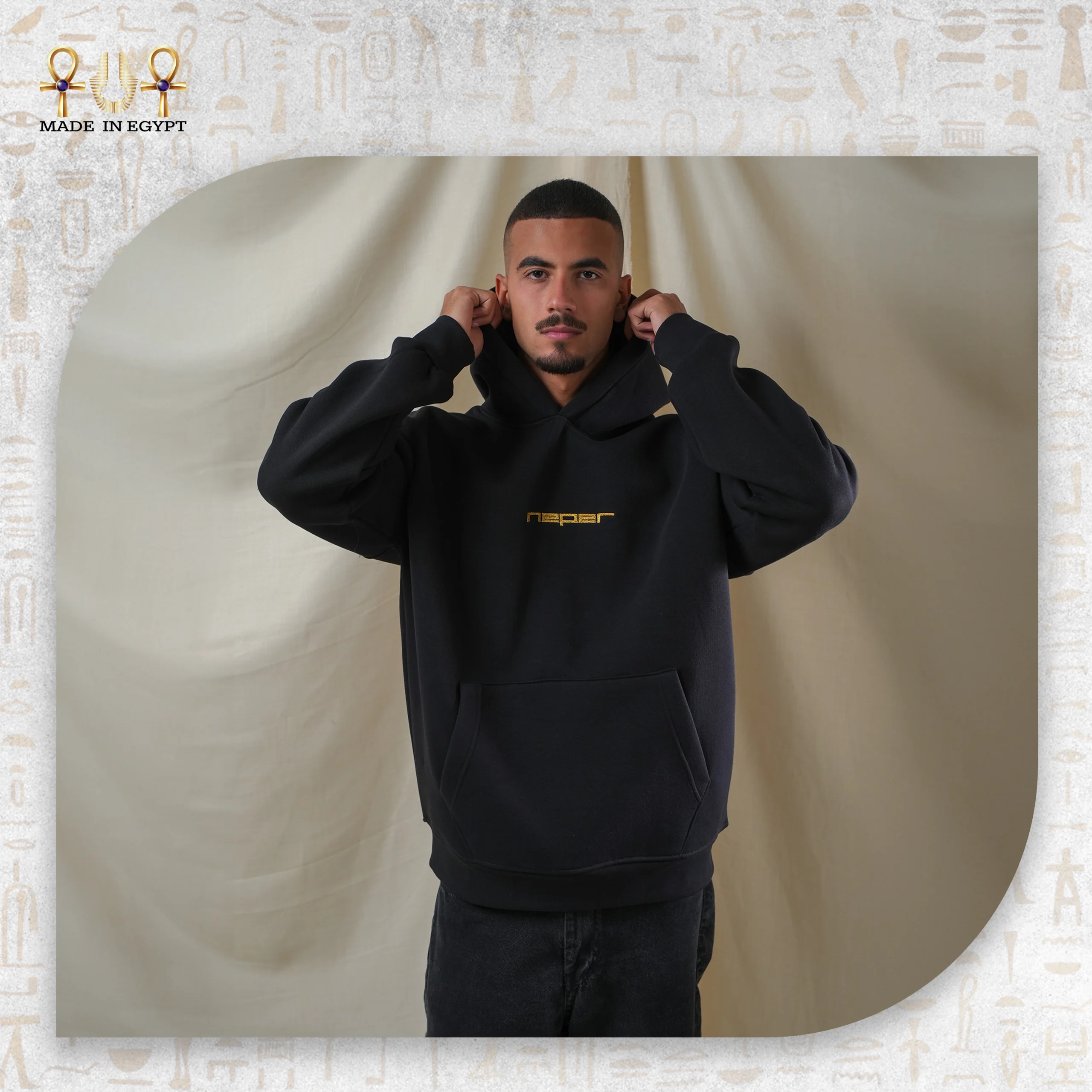 يتميز الواجهة الأمامية بتفاصيل بسيطة راقية تحمل شعار Neper الذهبي المطرز بدقة، بينما يزدان الجزء الخلفي برسم فني مهيب للإله أنوبيس — حارس العالم السفلي ورمز الحماية والتوازن بين الحياة والموت.