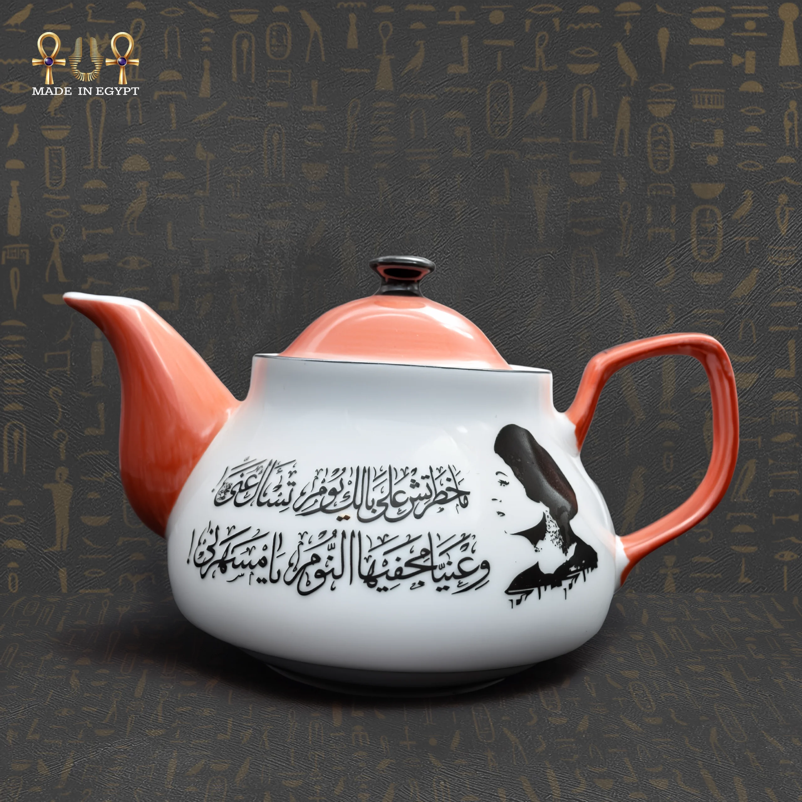 براد شاي بورسلين مزخرف بكلمات أغاني أم كلثوم وصورتها مع تفاصيل ذهبية وألوان مميزة.