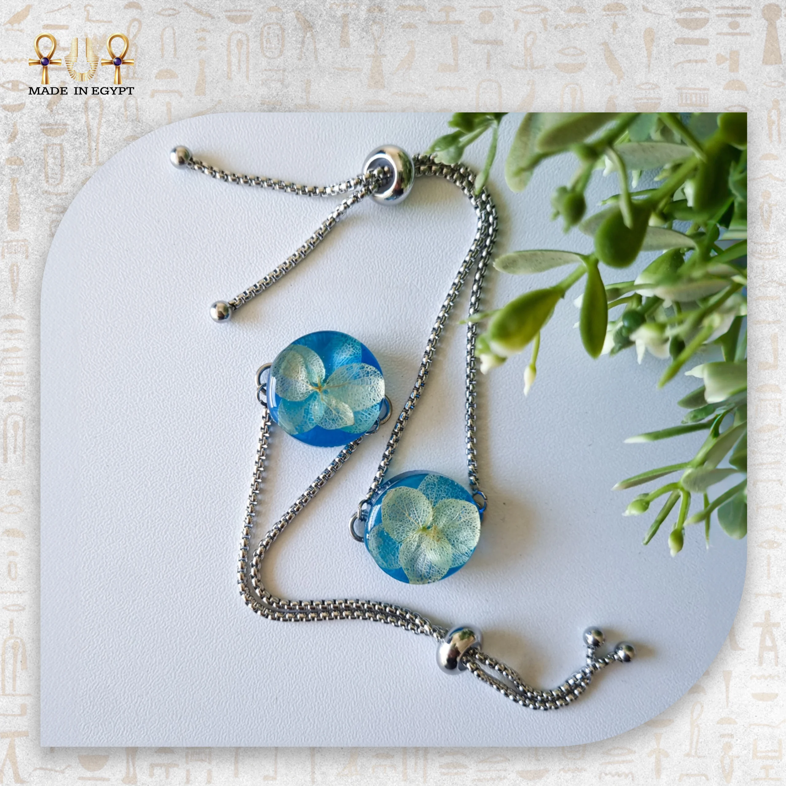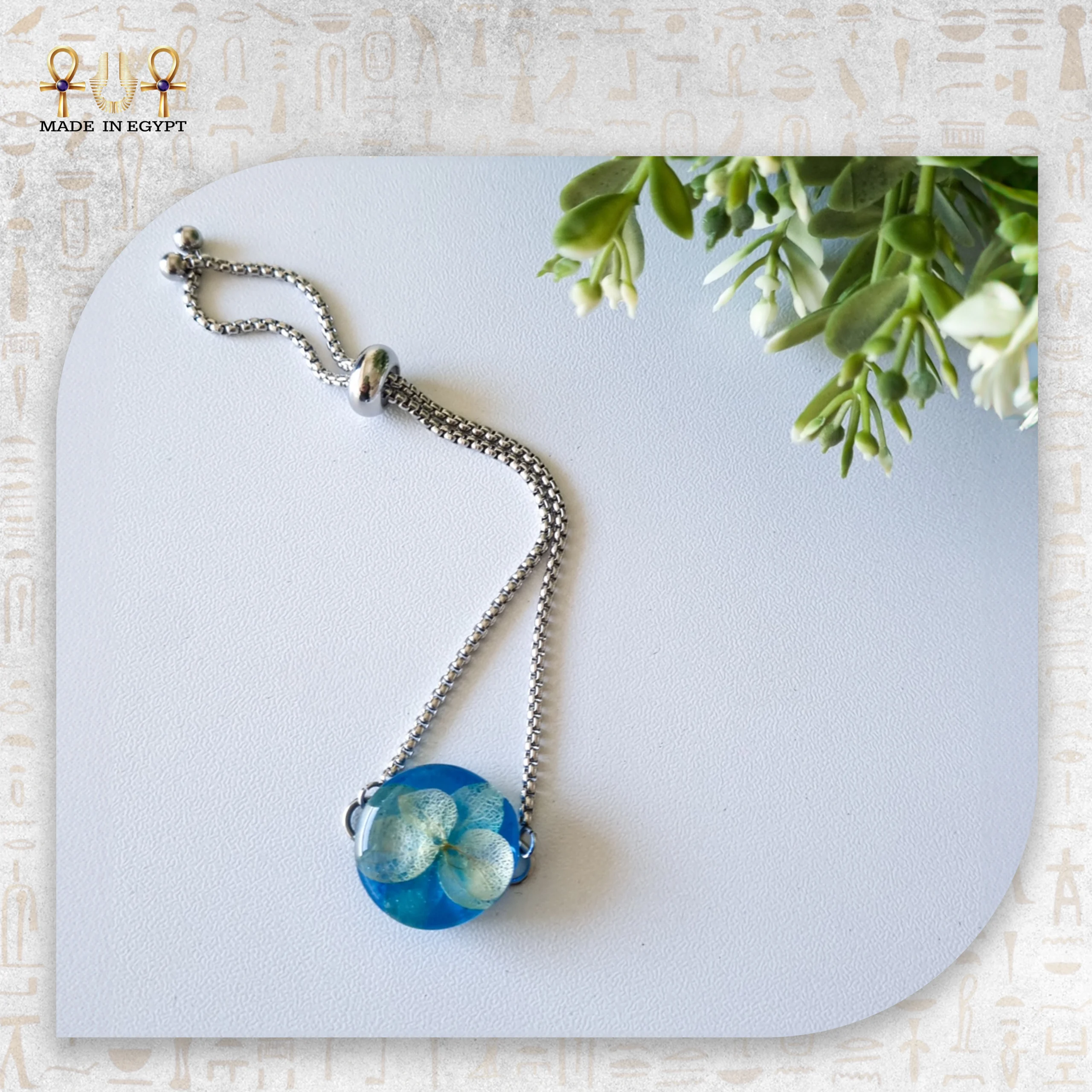 إنسيال يدوي من الريزن بلون أزرق مع ورد طبيعي مجفف، تصميم أنيق يعكس النعومة والصفاء.