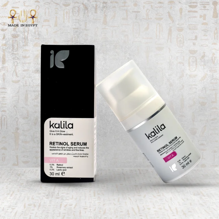 سيروم الريتينول من Kalila يعيد تجديد البشرة بفضل فيتامين A ومستخلص إكليل الجبل وحمض اللاكتيك، لتقليل التجاعيد وتحسين الملمس ومنح البشرة إشراقة شابة متجددة.