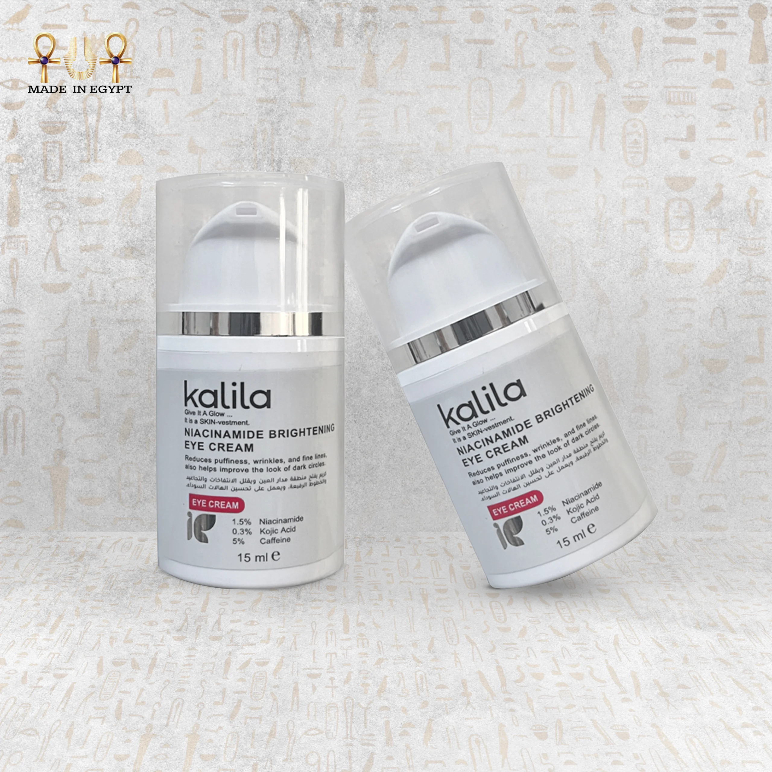 العيون هي أكثر ما يعبّر عن ملامح الوجه، لكنها أيضًا أول ما يظهر عليه علامات التعب والإجهاد والتقدّم في السن. لذلك، تم تطوير **كريم العين Kalila Niacinamide Brightening** بتركيبة علمية متقدمة تعالج جميع مشاكل منطقة تحت العين الحساسة، بدءًا من الهالات السوداء والانتفاخ، وصولًا إلى الخطوط الدقيقة وفقدان الإشراقة، ليمنحك مظهرًا أكثر شبابًا وانتعاشًا يومًا بعد يوم.