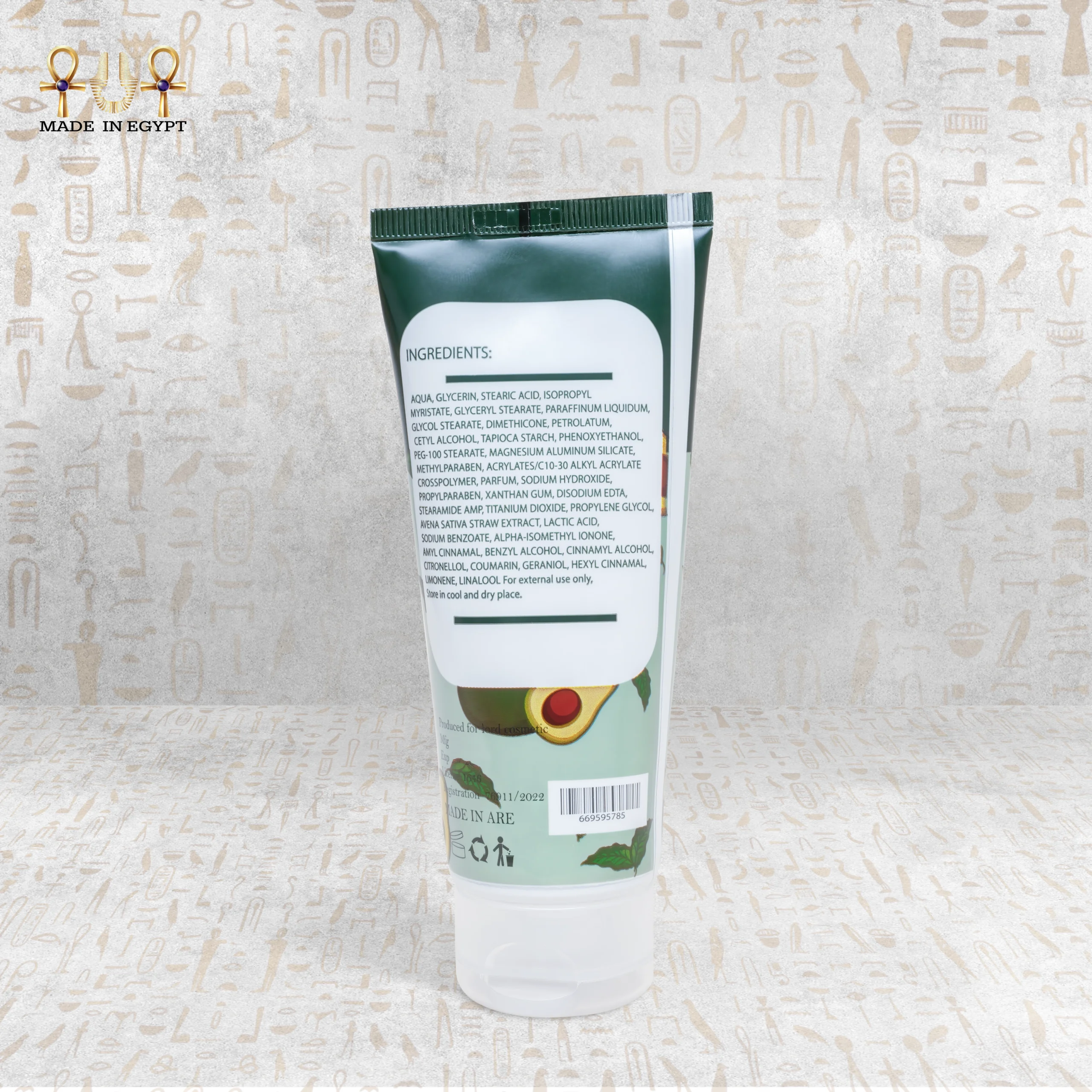 الأفوكادو معروف بخصائصه المرطبة والمغذية، حيث يحتوي على فيتامينات A وD وE، بالإضافة إلى الأحماض الدهنية الأساسية التي تعمل على إصلاح البشرة الجافة والمتشققة وتعزيز مرونتها. يعمل فيتامين E كمضاد أكسدة قوي يحمي خلايا الجلد من الجفاف والعوامل البيئية الضارة، ويمنح البشرة مظهرًا أكثر شبابًا ونعومة.