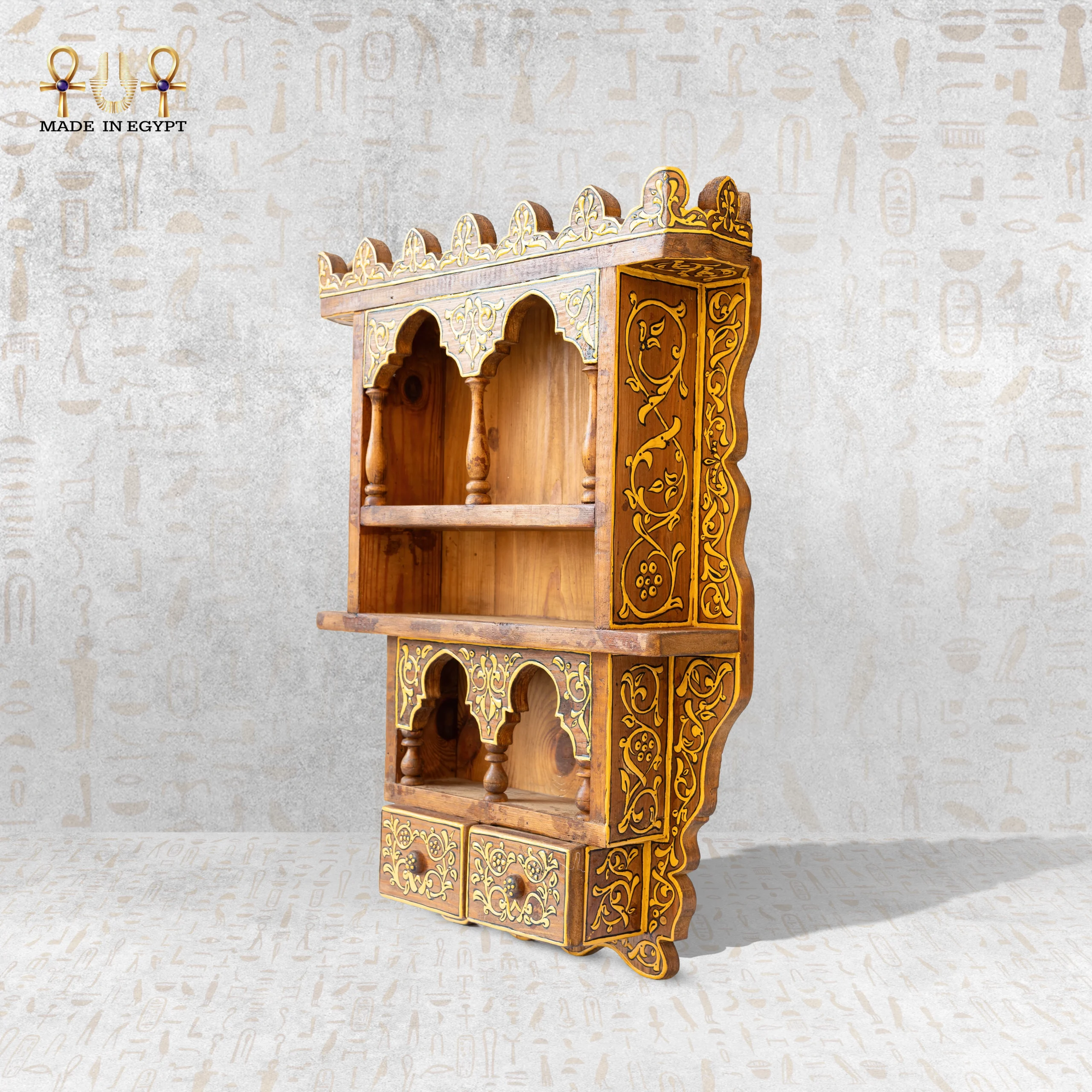 لا يقتصر هذا المدخل التراثي على كونه قطعة ديكور فقط. يمكن استخدامه كعنصر جداري مميز، أو كوحدة عرض صغيرة للمقتنيات والتحف. تصميمه المتوازن يجعله مناسبًا للمداخل، غرف المعيشة، الزوايا التراثية، أو المساحات الحديثة التي تبحث عن لمسة أصيلة تضيف عمقًا بصريًا وثقافيًا.