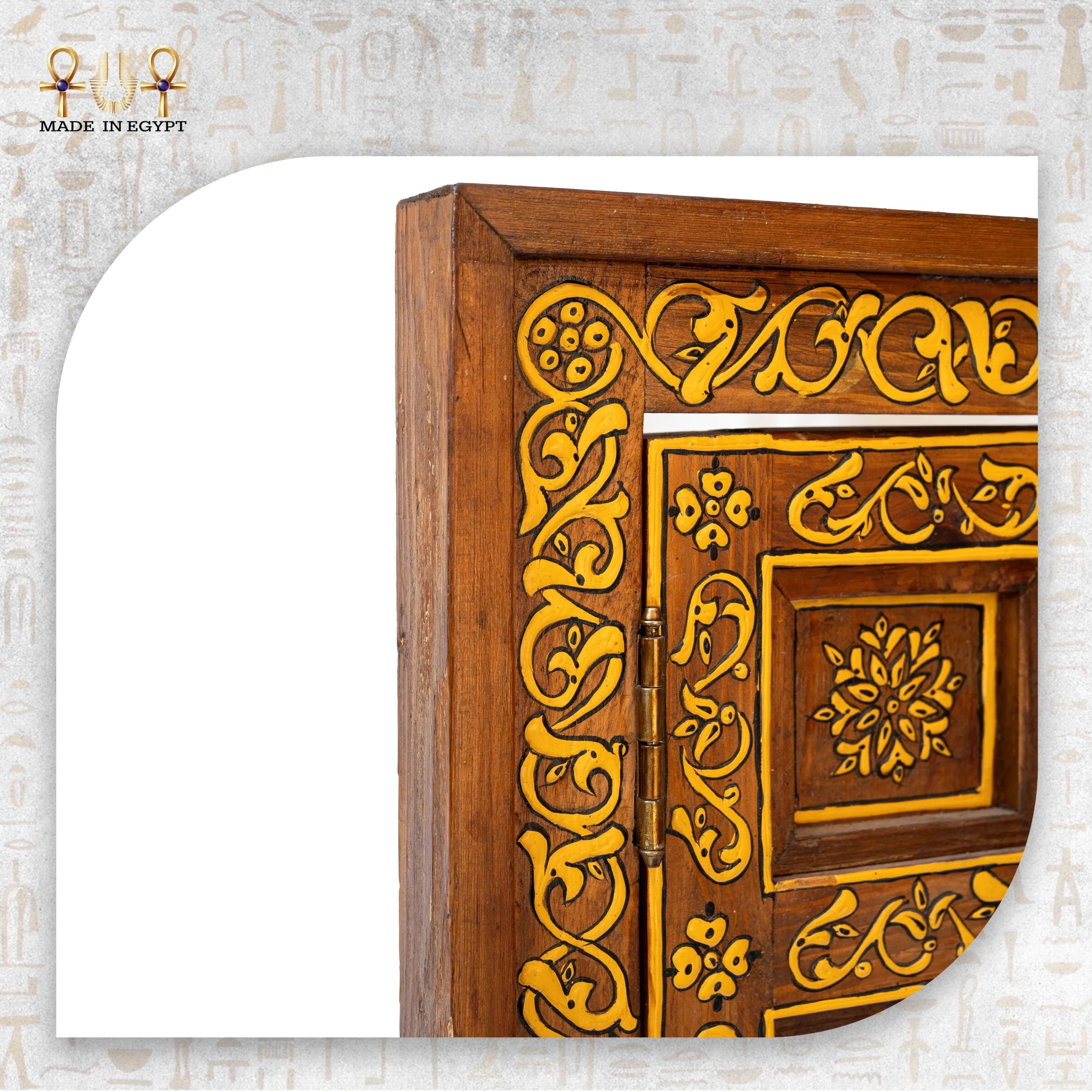 صُنع هذا المدخل التراثي من خشب طبيعي مختار بعناية ليبرز جمال الخامة ودفئها. تم الحفاظ على العروق الطبيعية التي تمنح كل قطعة طابعًا فريدًا. كما نُفذت الزخارف يدويًا بأسلوب الأرابيسك، حيث تتداخل الخطوط النباتية والهندسية بانسجام بصري يعكس التوازن والدقة في الفنون الإسلامية. إضافةً إلى ذلك، يمنح اللون الذهبي إحساسًا بالفخامة الهادئة ويعزز حضور القطعة كعنصر معماري مميز.