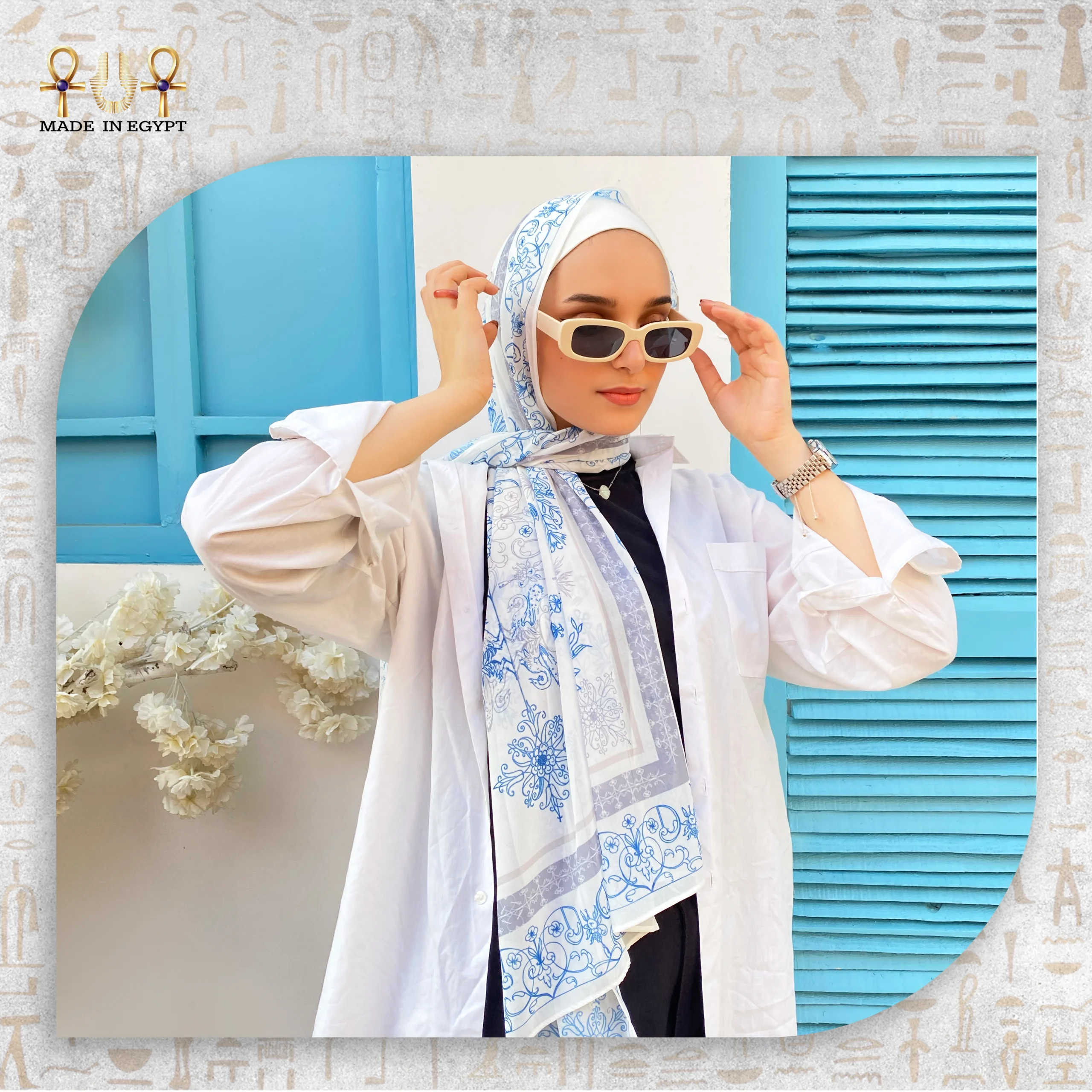 تتميّز انجليكا بقاعدة عاجية ناعمة تضيء الملامح برفق، بينما تتناثر الزخارف النباتية واللولبية بالأزرق السماوي والكوبالت داخل إطارات رمادية رفيعة. التصميم مستوحى من فنون الخزف المتوسطي والنقوش العربية الدقيقة، مما يمنح الطرحة طابعًا فنيًا يجمع بين التراث والعصرية. بالإضافة إلى ذلك، تتوزع الطبعات بتنظيم “بانوهات” هندسية متوازنة، فتظهر التفاصيل بوضوح من كل زاوية وتبدو رائعة في الصور.