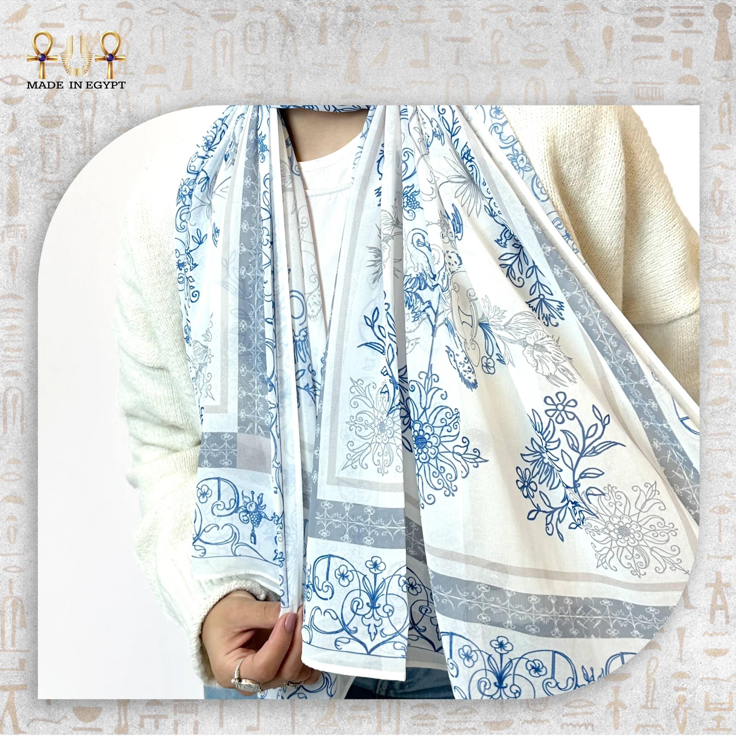 طرحة شيفون ناعمة بنقوش زرقاء وإطارات رمادية تظهر أنيقة وواضحة في الصور.