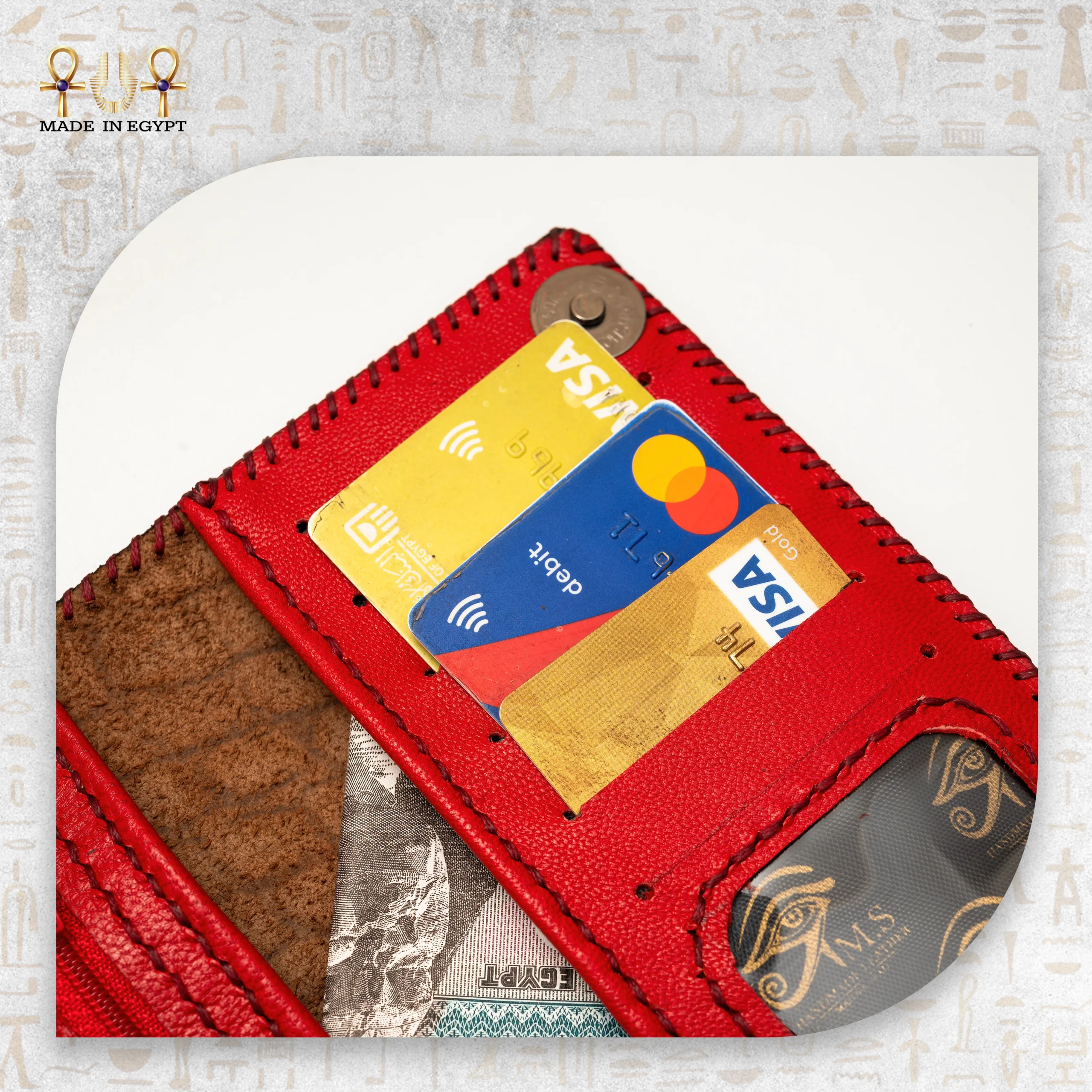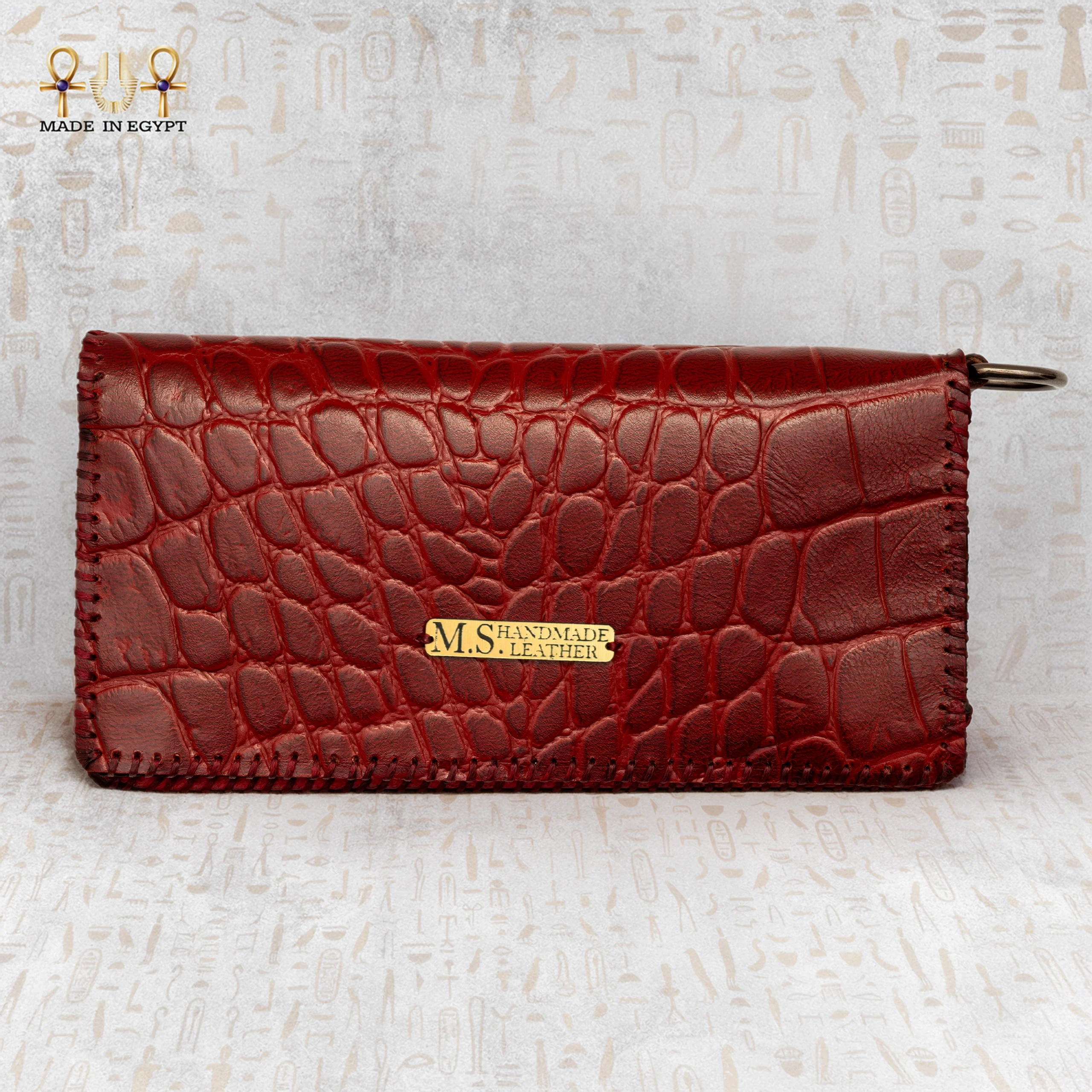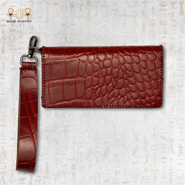 برتفـية جلد طبيعي بنقشة التمساح، صناعة يدوية مستوحاة من الفخامة الفرعونية. تحتوي على ٤ أماكن للكروت، جيب للبطاقة، ٢ جيب داخلي، وسوستة، بدواخل جلد ماعز درجة أولى وإكسسوارات نحاس.