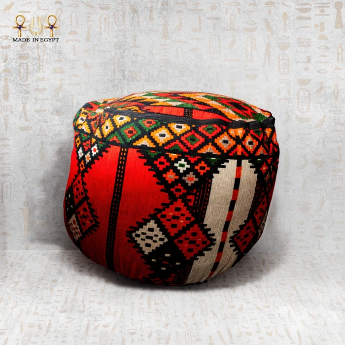 بوف جوهرة البادية قطعة فنية فريدة تمزج بين الجمال التراثي والراحة العصرية، مصنوعة من القماش العربي اليدوي الغني بنقوشه الهندسية وألوانه الدافئة المستوحاة من قلب الصحراء المصرية. الألوان النارية المكونة من الأحمر، البرتقالي، الأخضر، والأسود تجتمع بتناغم مدهش لتمنحك قطعة ديكور نابضة بالحياة تعكس روح البدو الأصيلة.