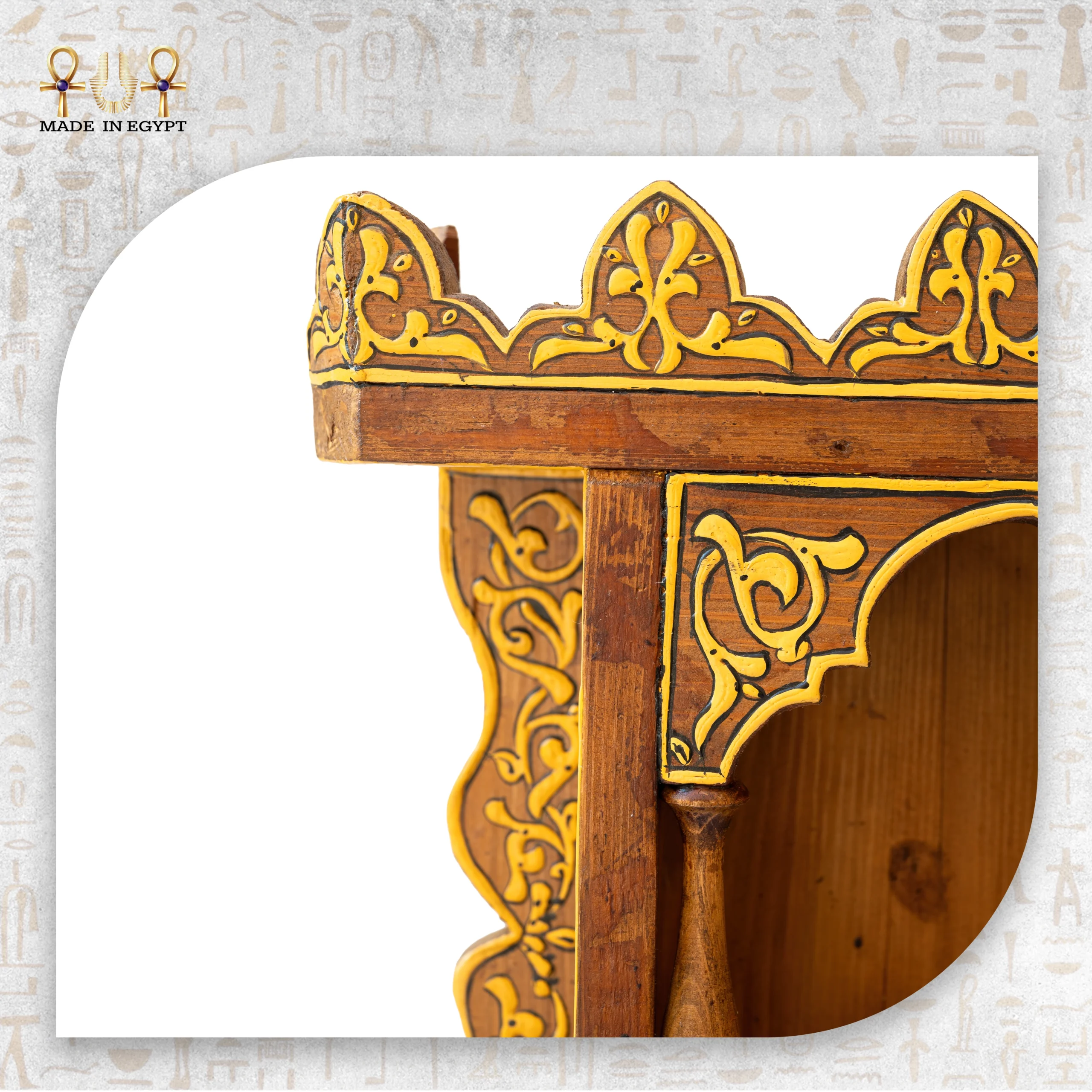 صُنع الهيكل التراثي من خشب طبيعي بعناية فائقة ليعكس جمال الخامة ودفئها. كما تم إبراز عروق الخشب وتدرجاته الطبيعية، ما يمنح كل قطعة طابعًا فريدًا. وزُيّن الهيكل بزخارف محفورة وملوّنة يدويًا مستوحاة من فن الأرابيسك. إضافةً إلى ذلك، تتداخل الخطوط النباتية والهندسية بانسجام بصري يعكس التوازن والدقة في الفن الإسلامي.