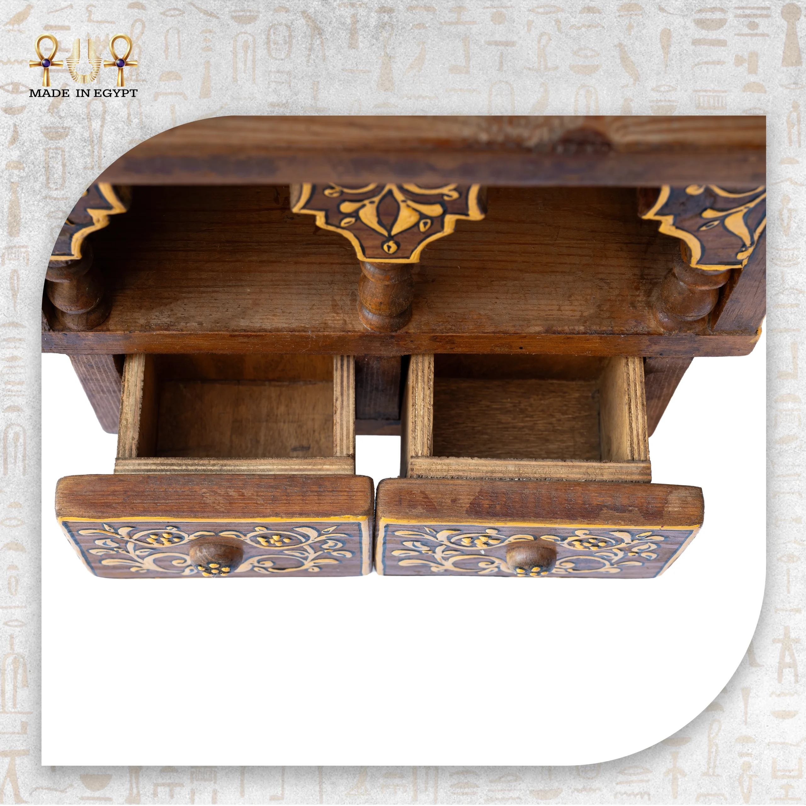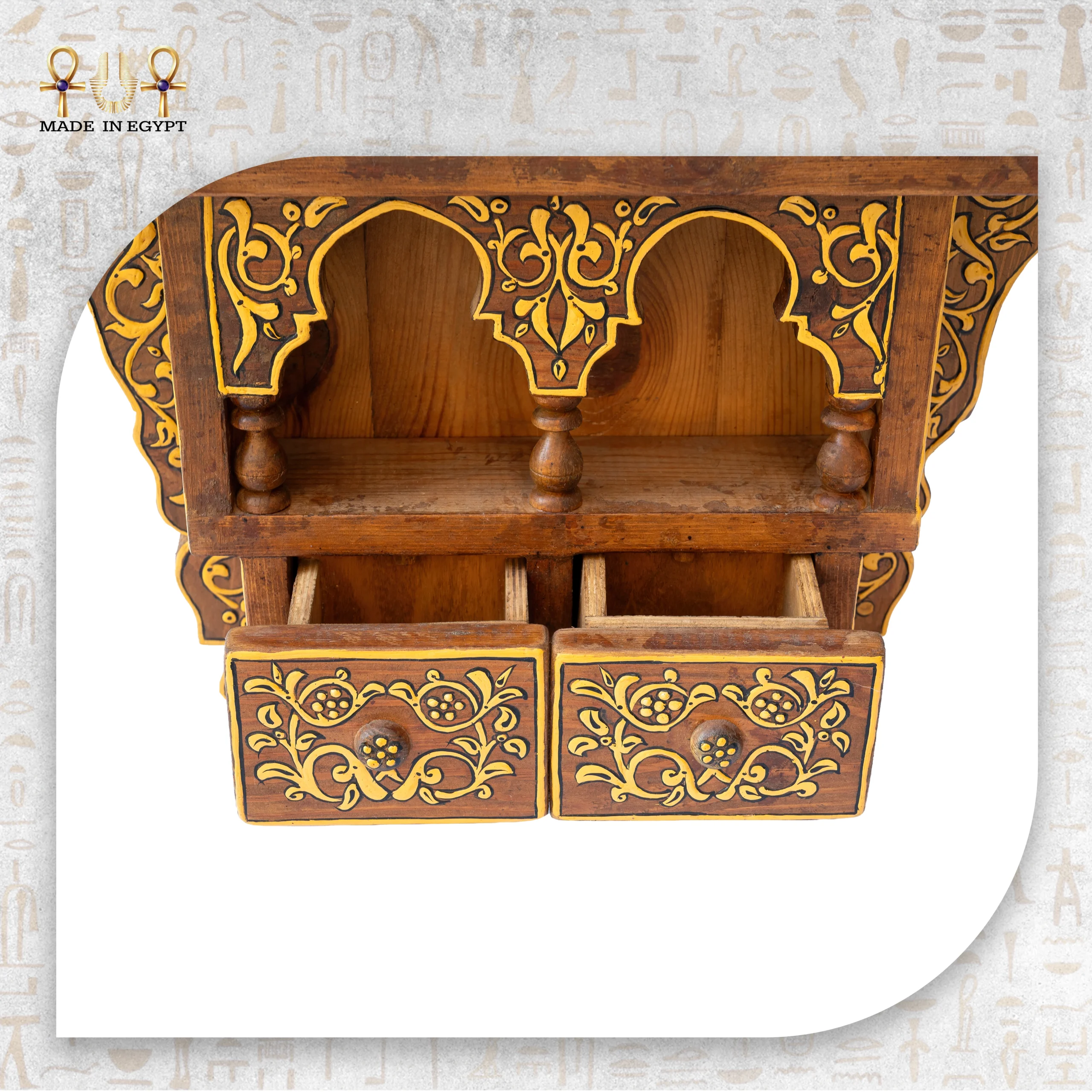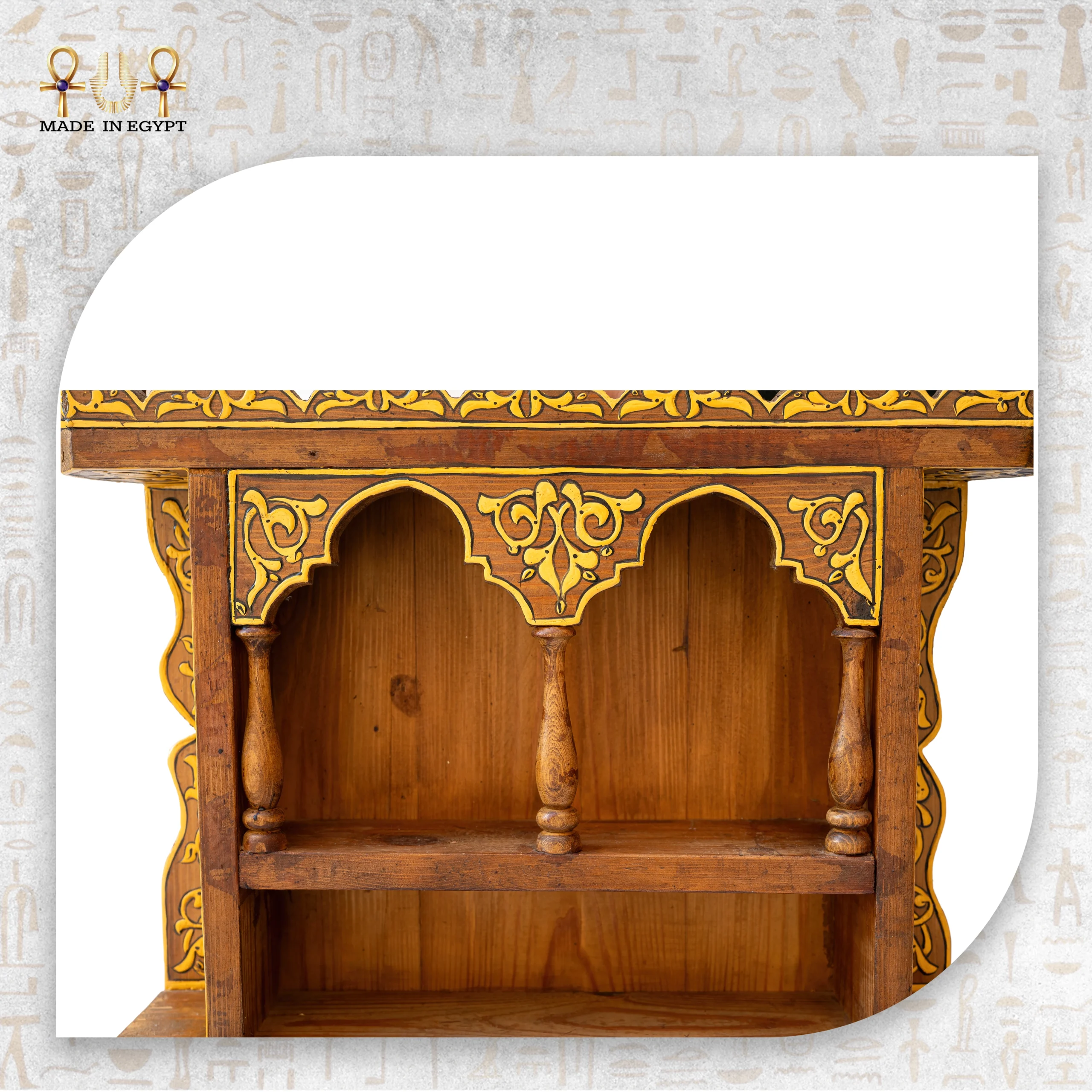 يضم الهيكل التراثي رفوفًا عملية ومساحات تخزين صغيرة، بالإضافة إلى أدراج مزخرفة. لذلك، يمكن استخدامه لعرض القطع الديكورية، التحف الصغيرة، الكتب، أو المقتنيات الخاصة. كما يجعله تصميمه المتوازن مناسبًا لغرف المعيشة، المداخل، الزوايا الهادئة، أو المساحات ذات الطابع التراثي.