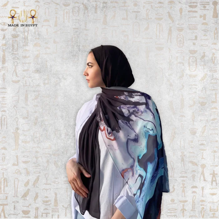 تتميّز تطور التوقيع بتصميم فني مستوحى من تدفق الألوان المائية، حيث تمتزج درجات الأسود والأزرق الفاتح مع الرمادي والأحمر بتناغم مدهش. هذا المزيج اللوني يمنح الطرحة طابعًا فنيًا ساحرًا يجعلها قطعة فريدة تُعبّر عن الذوق الراقي والأنوثة الهادئة في الوقت نفسه. بالإضافة إلى ذلك، تضيف الخطوط المتماوجة لمسة من الحيوية والانسيابية التي تبرز جمال القماش عند ارتدائها.