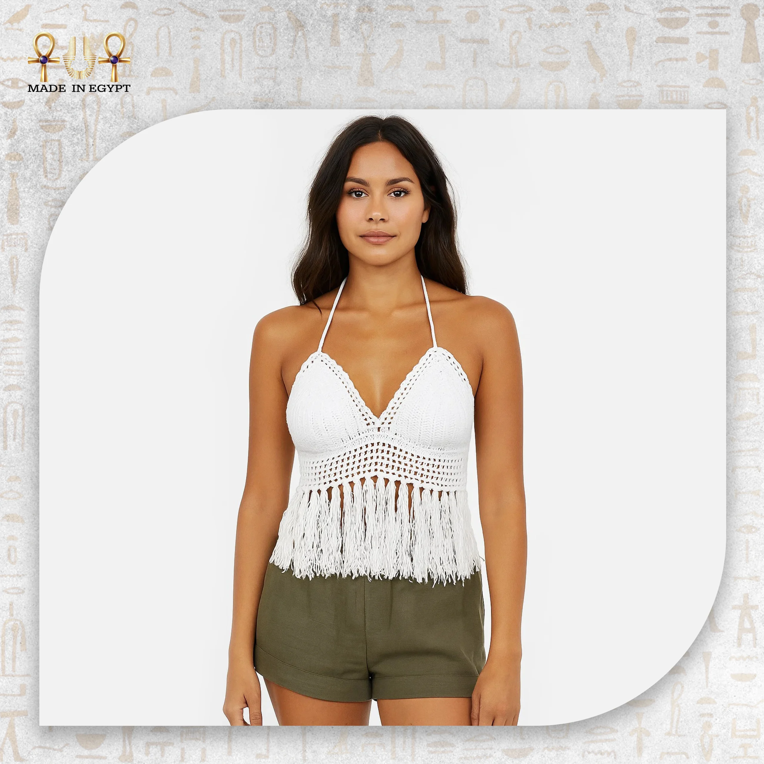 توب كروشيه بحمالة عنق وشراشيب – لمسة بوهيمية لصيف أنيق