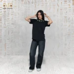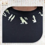 تُزيّن مقدمة التيشيرت صورة الإله أنوبيس، حارس العالم الآخر عند المصريين القدماء، في طباعة فنية دقيقة تنقل الإحساس بالقوة والغموض. هذه الرسومات الهيروغليفية لا تُعد مجرد تفاصيل زخرفية، بل هي رمز للحكمة والخلود، مما يجعل التصميم غنيًا بالمعاني العميقة.