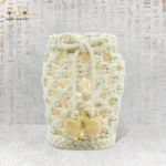يزين الجزء العلوي من البرطمان فيونكة متقنة مصنوعة من نفس الخيط. بالإضافة إلى ذلك، تتدلى منها كرات خشبية صغيرة تضيف لمسة طبيعية دافئة تزيد من جمال التصميم.