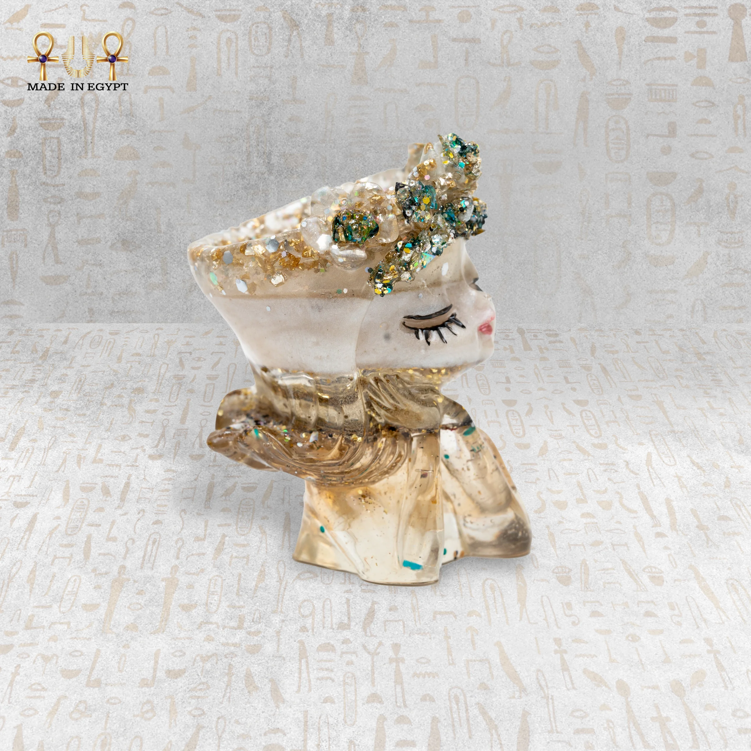 يتميز التصميم بتاج مزين بحبيبات لامعة متعددة الألوان مع لمسات من الأخضر والذهبي، مما يضيف لمسة فاخرة وجذابة تعكس الضوء بشكل أنيق. كما أن الجسم الشفاف بدرجات البيج يحتوي على تفاصيل لامعة دقيقة تمنح القطعة طابعًا عصريًا ومميزًا.
