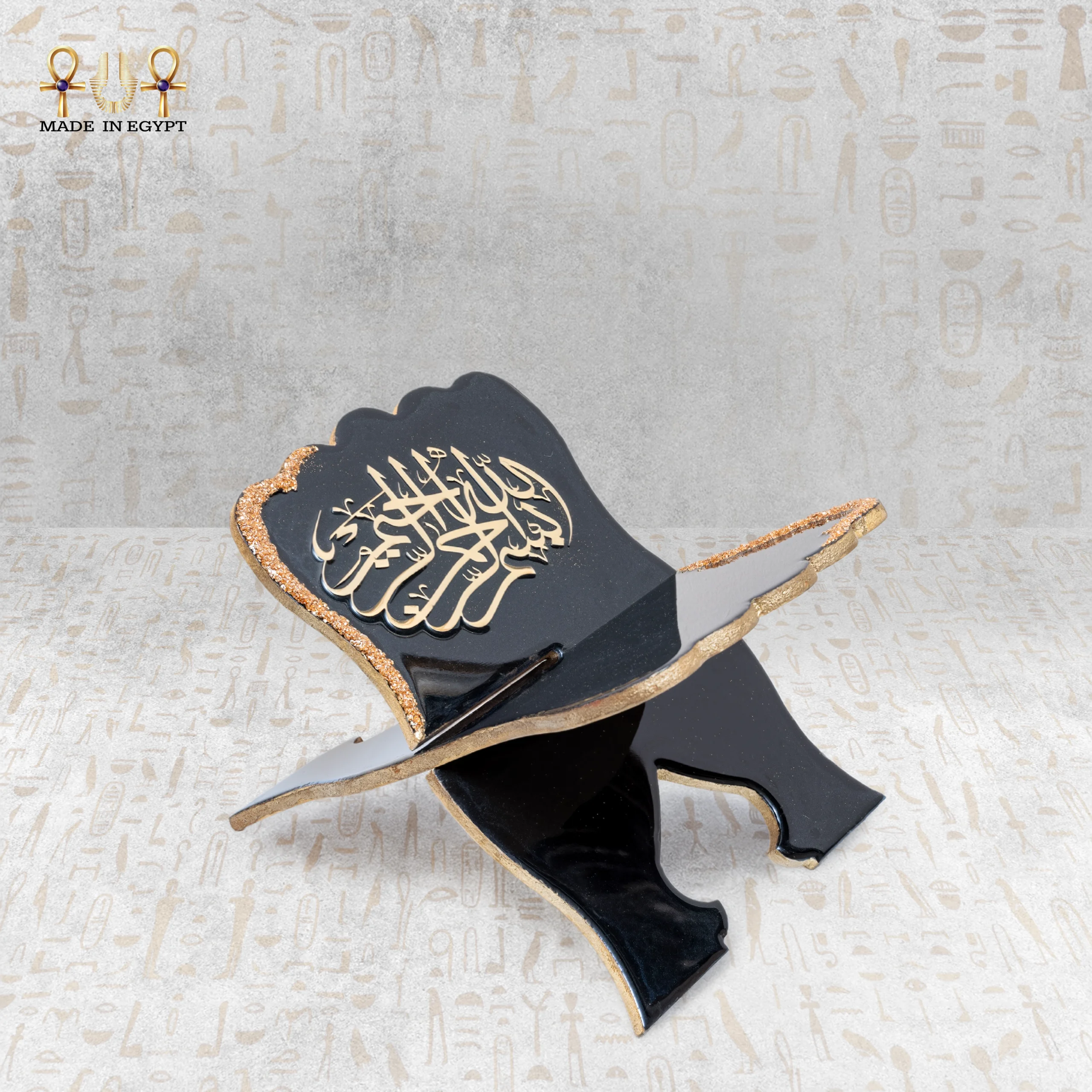 اللون الأسود العميق يضفي إحساسًا بالوقار والهيبة، بينما تأتي الحواف مزينة بلمسات ذهبية لامعة تضيف طابعًا فاخرًا يعكس العناية بأدق التفاصيل. ويتوسط الحامل نقش عربي أنيق لعبارة “القرآن الكريم”، محفور بدقة ليبرز جمال الخط العربي ويعزز القيمة الروحانية للقطعة.