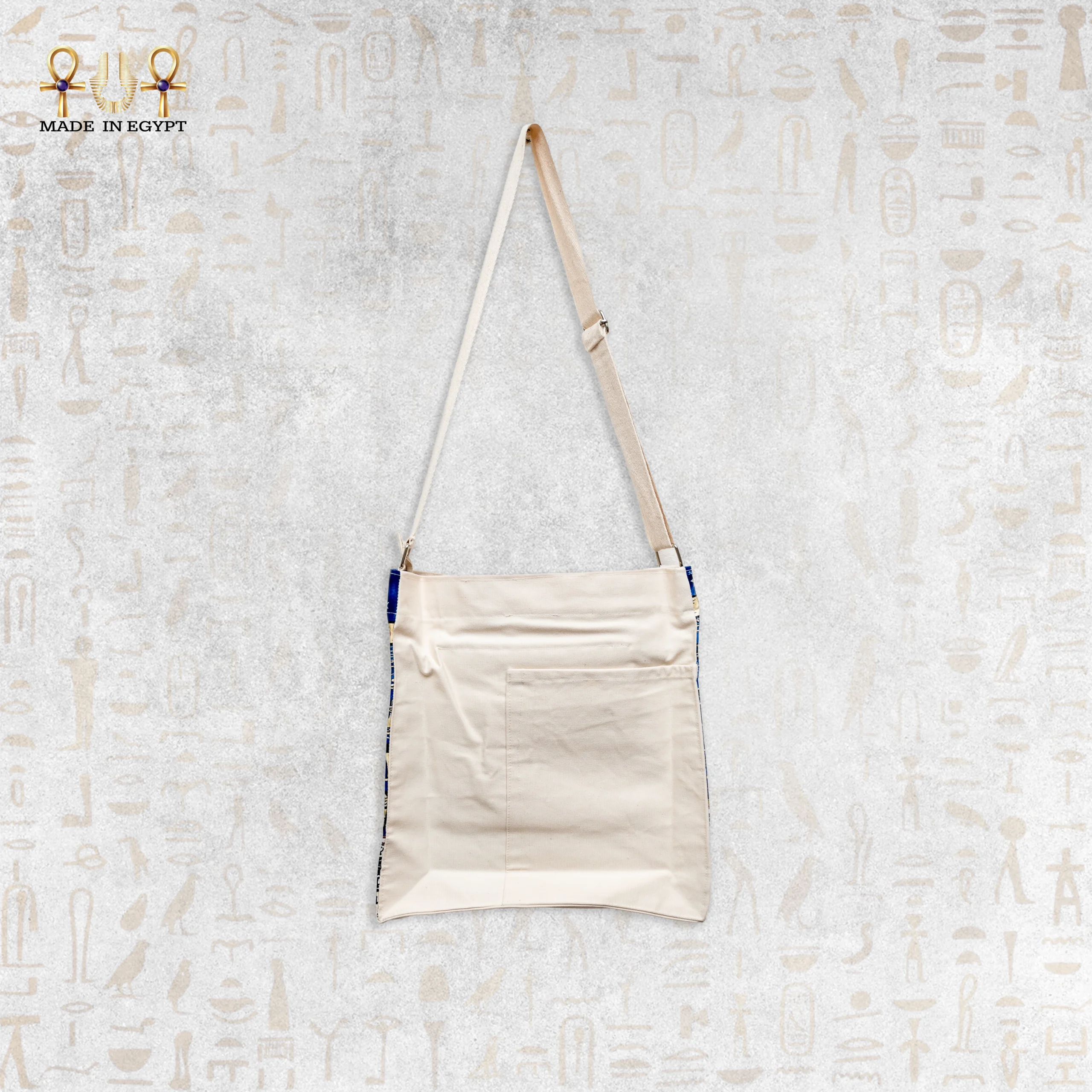تحول هذه الحقيبة قطعة من التراث المصري إلى تصميم عصري يمكن استخدامه يوميًا. تعكس الألوان الزرقاء العميقة مع النجوم الذهبية روح الفن المصري القديم، مما يجعل الحقيبة تبدو وكأنها لوحة أثرية صغيرة يمكن حملها معك في حياتك اليومية.