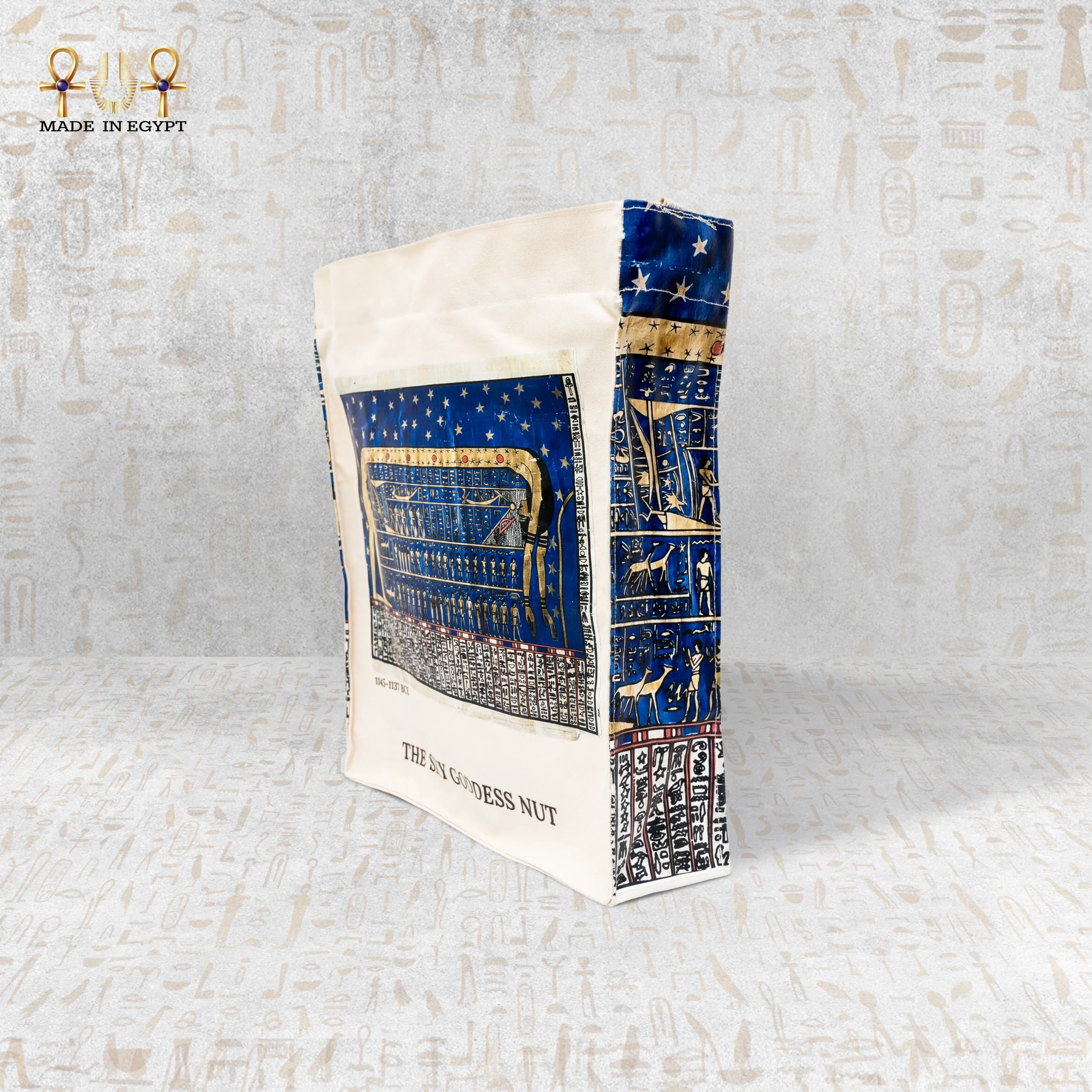 حقيبة كتف من الكتان الدَك التقيل بسمك 800 جرام للمتر مزينة بطباعة مستوحاة من الإلهة نوت إلهة السماء في الحضارة المصرية القديمة بتقنية DTF بألوان زاهية وثابتة.