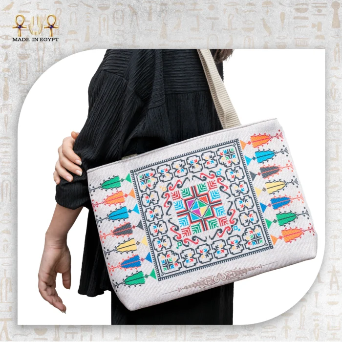 حقيبة التراث الملون تجمع بين الأصالة والحداثة في تصميم فريد يحتفي بجمال النقوش التقليدية المستوحاة من التراث العربي والمصري القديم. تأتي الحقيبة برسومات هندسية دقيقة تتداخل فيها الألوان الزاهية مثل الأحمر، الأزرق، الأخضر، والأصفر. هذه الألوان تشكل لوحة فنية تنبض بالحياة وتعبر عن روح الفنون اليدوية القديمة، ولكن بأسلوب عصري يناسب الذوق الحديث.