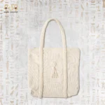 يتميز تصميم Natural Knot Tote بالبساطة والعملية. تم تزيينها بخيوط مكرمية يدوية اللون عاجي، تتشكل في عقدة مركزية مع شراشيب رقيقة. هذا يضفي إحساسًا بالدفء والأنوثة. بالإضافة إلى ذلك، يعكس النمط الفني مهارة الحرفيين المصريين في دمج الجمال التقليدي مع لمسة عصرية تناسب مختلف الأذواق.