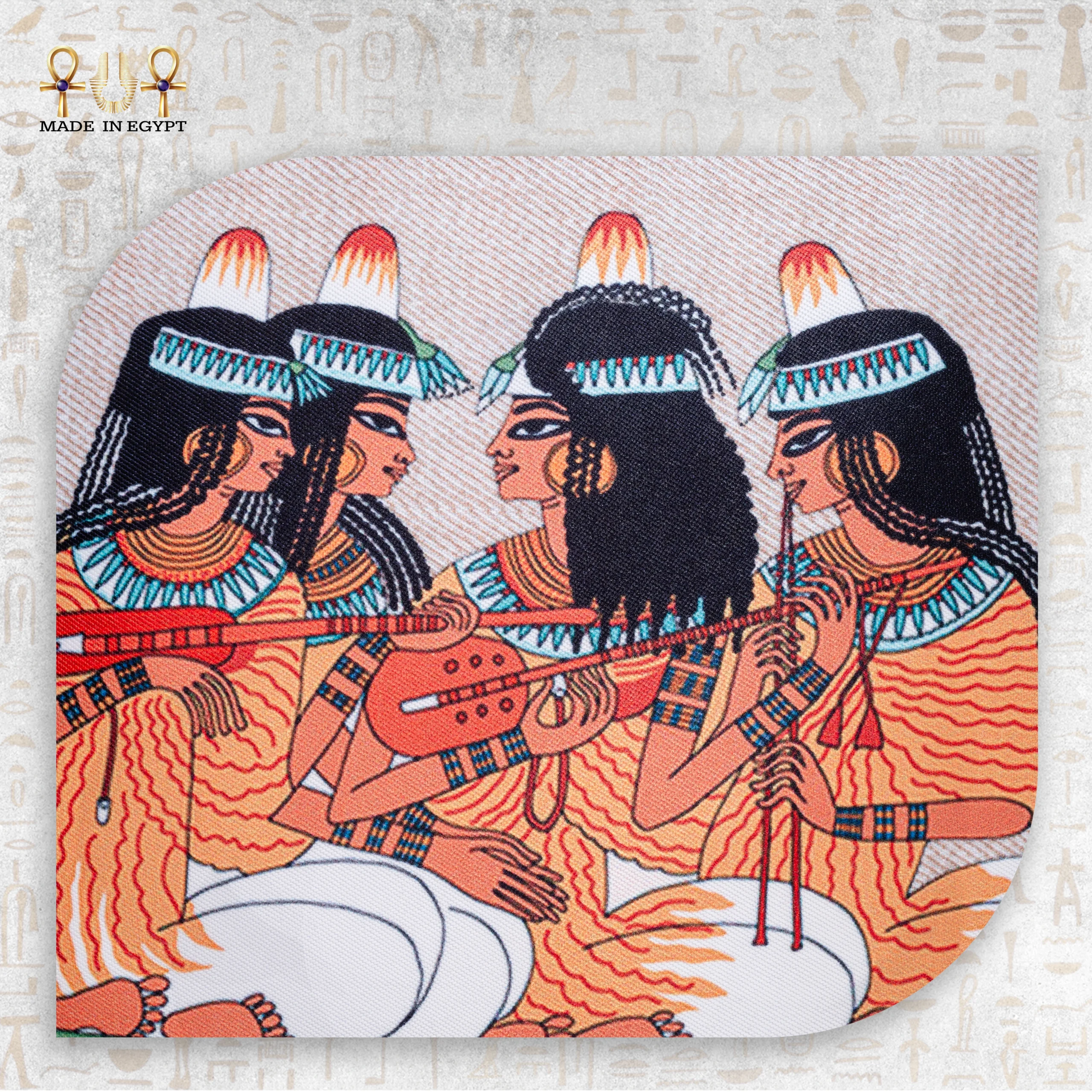 تتميز برسومات دقيقة مستوحاة من الجداريات الفرعونية، والتي تُجسد مشهدًا لمجموعة من العازفات المصريات القديمات. وهنّ يعزفن على آلات موسيقية تقليدية، في مشهد متناغم يرمز إلى الفرح والانسجام. علاوة على ذلك، تضيف الألوان الدافئة مثل البرتقالي والذهبي والأزرق الفيروزي طابعًا نابضًا بالحياة يُعبر عن روح الفن المصري الأصيل.
