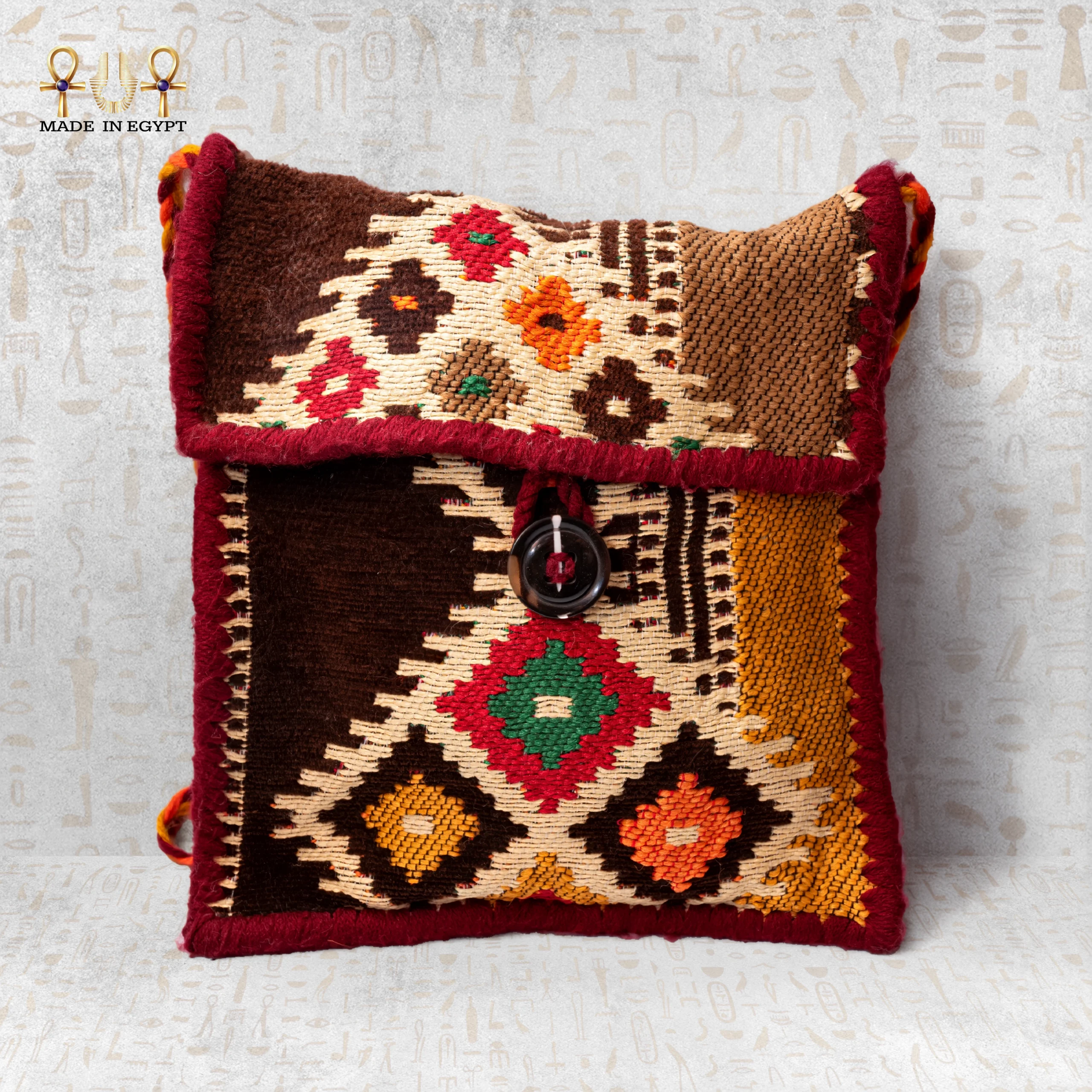 شنطة يدوية من القماش العربي بألوان ترابية دافئة ونقوش بدوية أصيلة.
