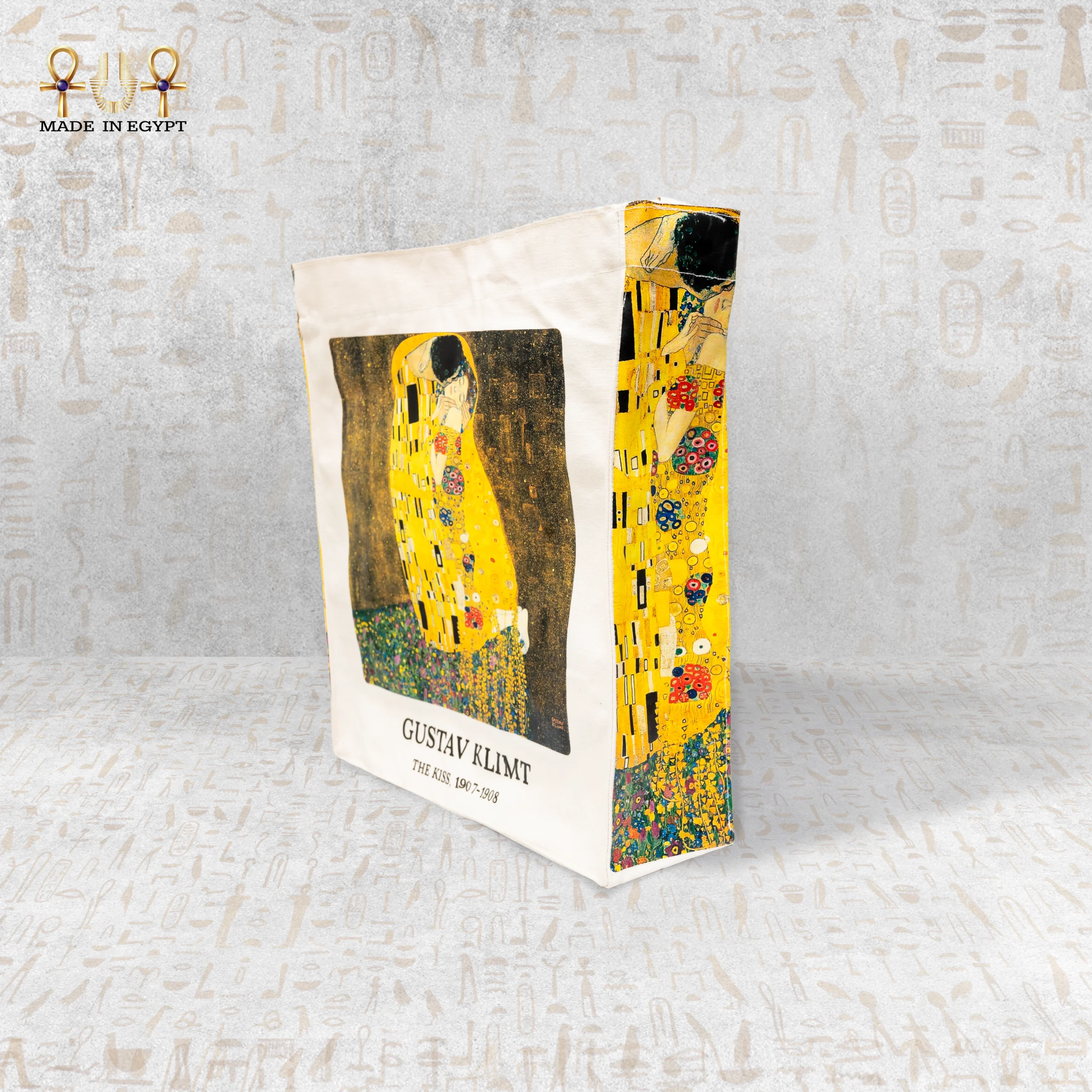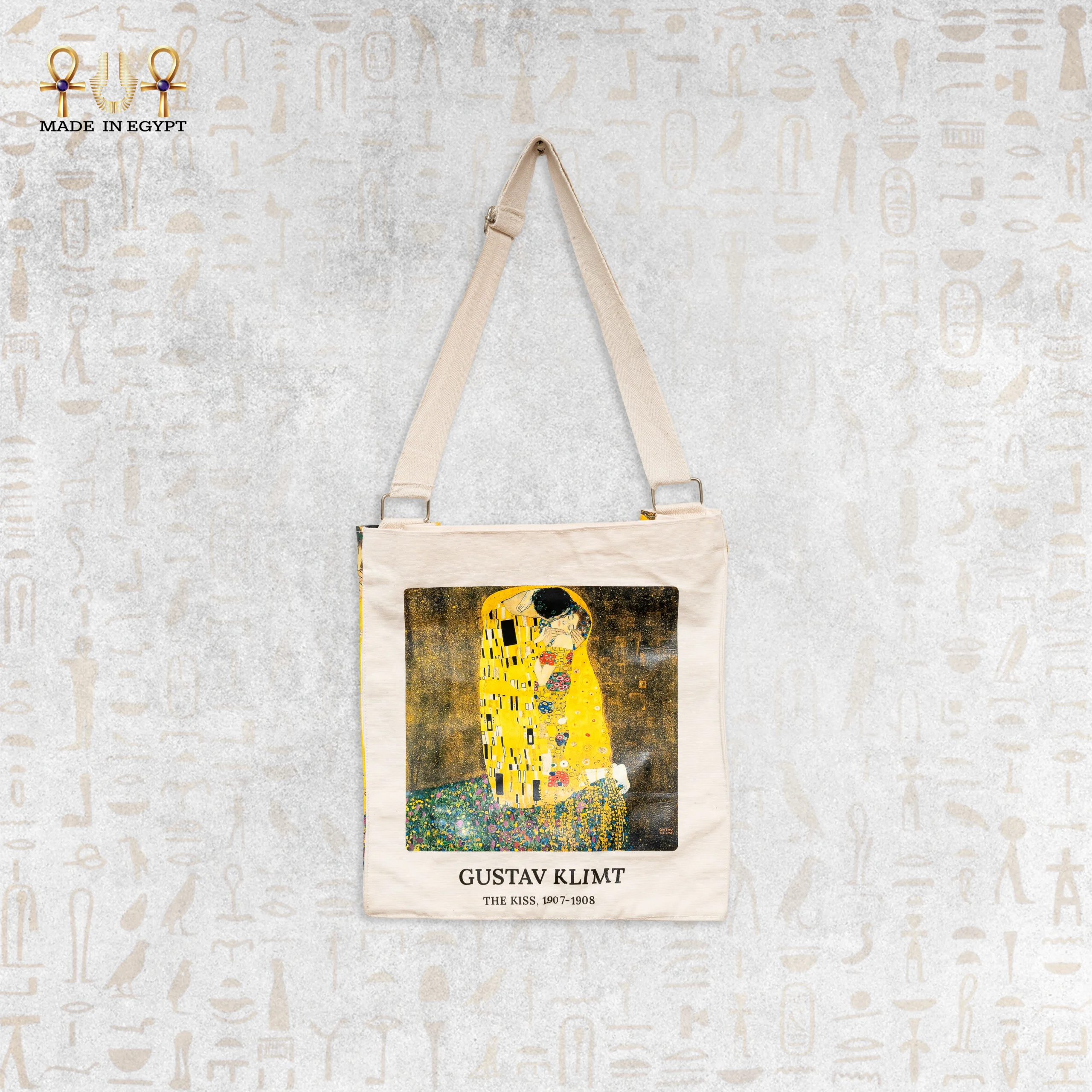 حقيبة كتف من الكتان الدَك التقيل مزينة بطباعة مستوحاة من لوحة “The Kiss” للفنان غوستاف كليمت بتقنية DTF بألوان زاهية وثابتة، تجمع بين الفن الكلاسيكي والاستخدام اليومي.
