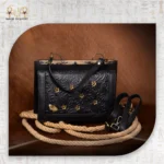 تتوفر الحقيبة بألوان فاخرة، مثل الأزرق الملكي الجذاب أو الأسود الكلاسيكي الأنيق، وكلاهما يأتي مع قطع نحاسية تضيف تضادًا لونيًا راقيًا يبرز جمال النقوش والورود المعدنية.