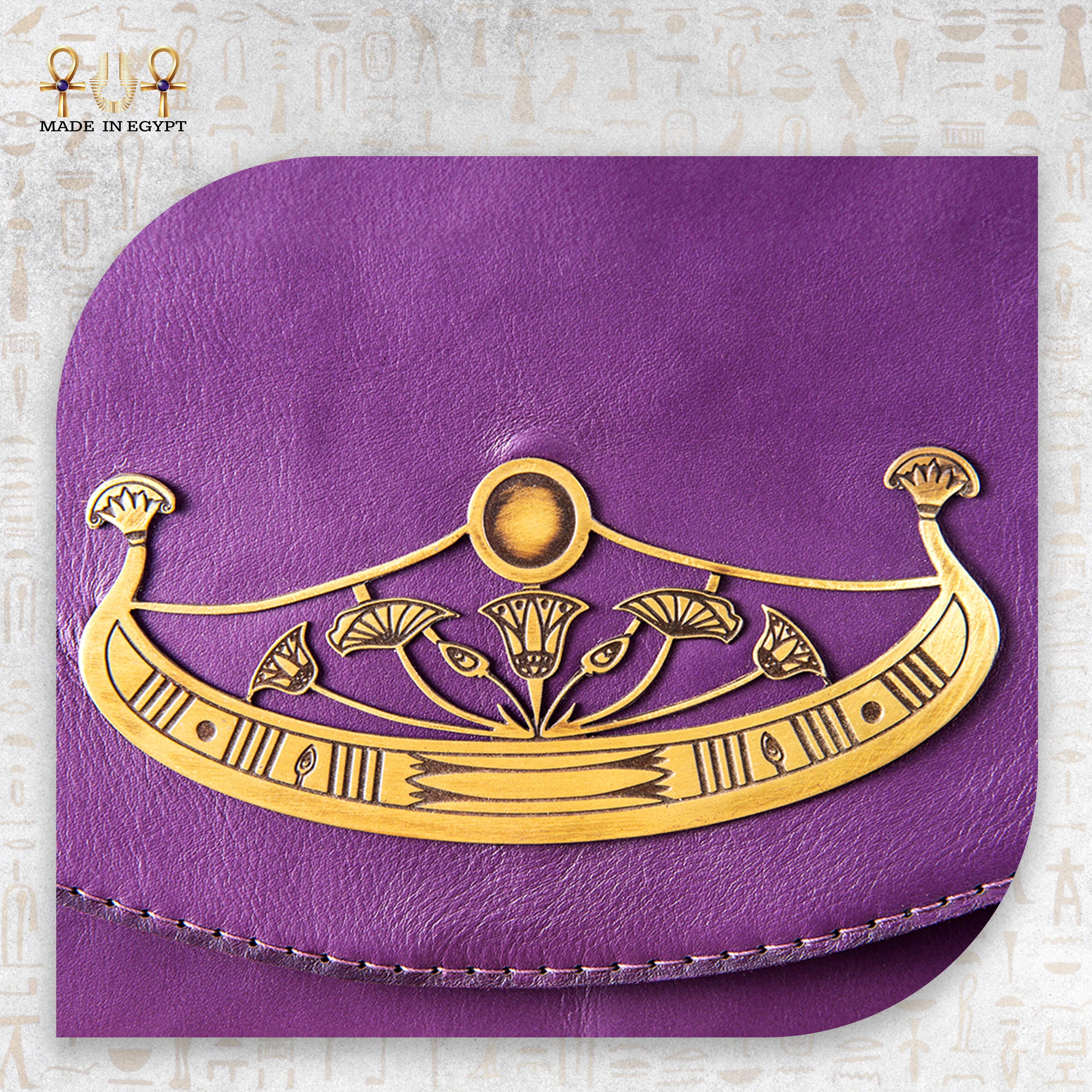 حقيبة جلد طبيعي مستوحاة من مركب الشمس وزهور اللوتس رمز التجدد والنقاء.