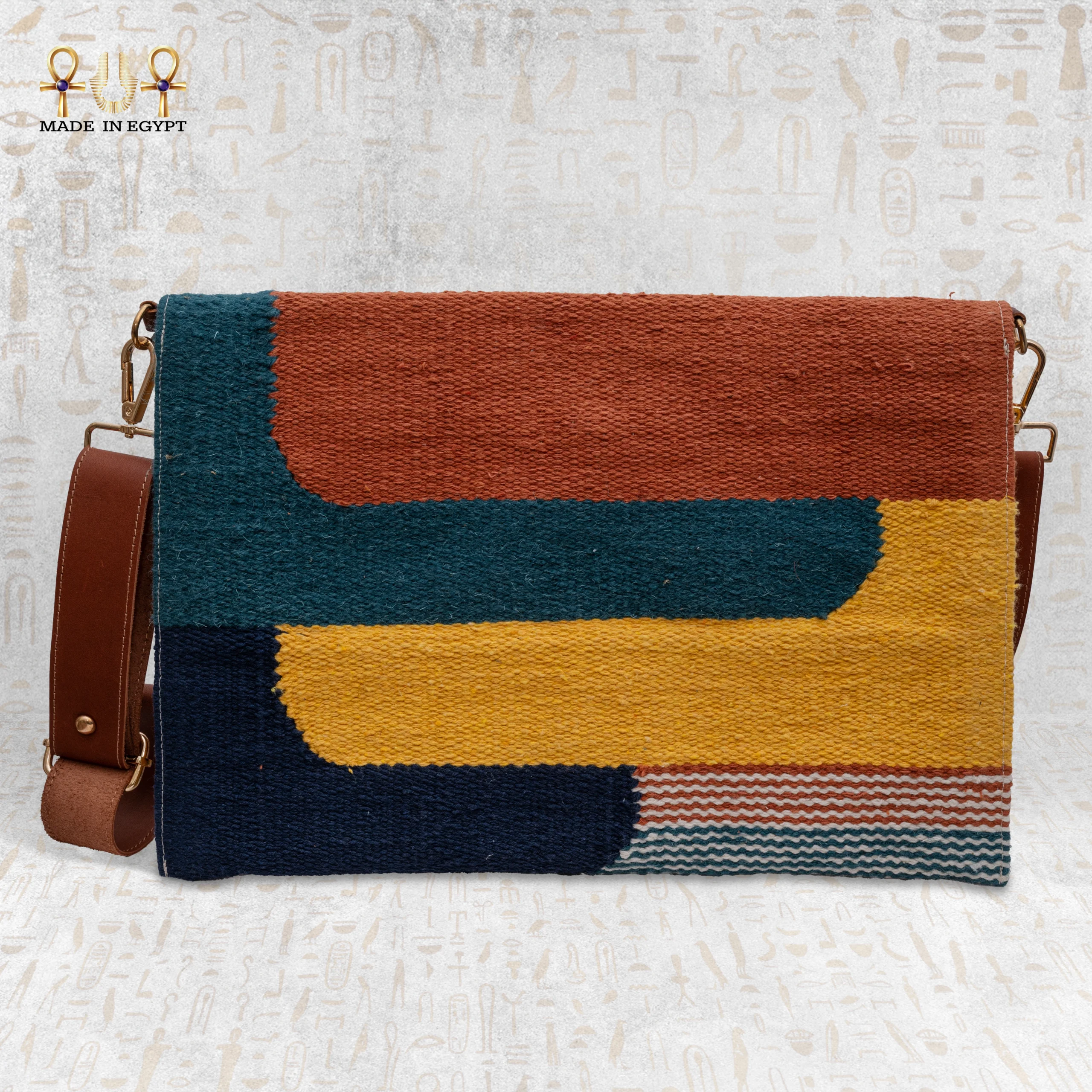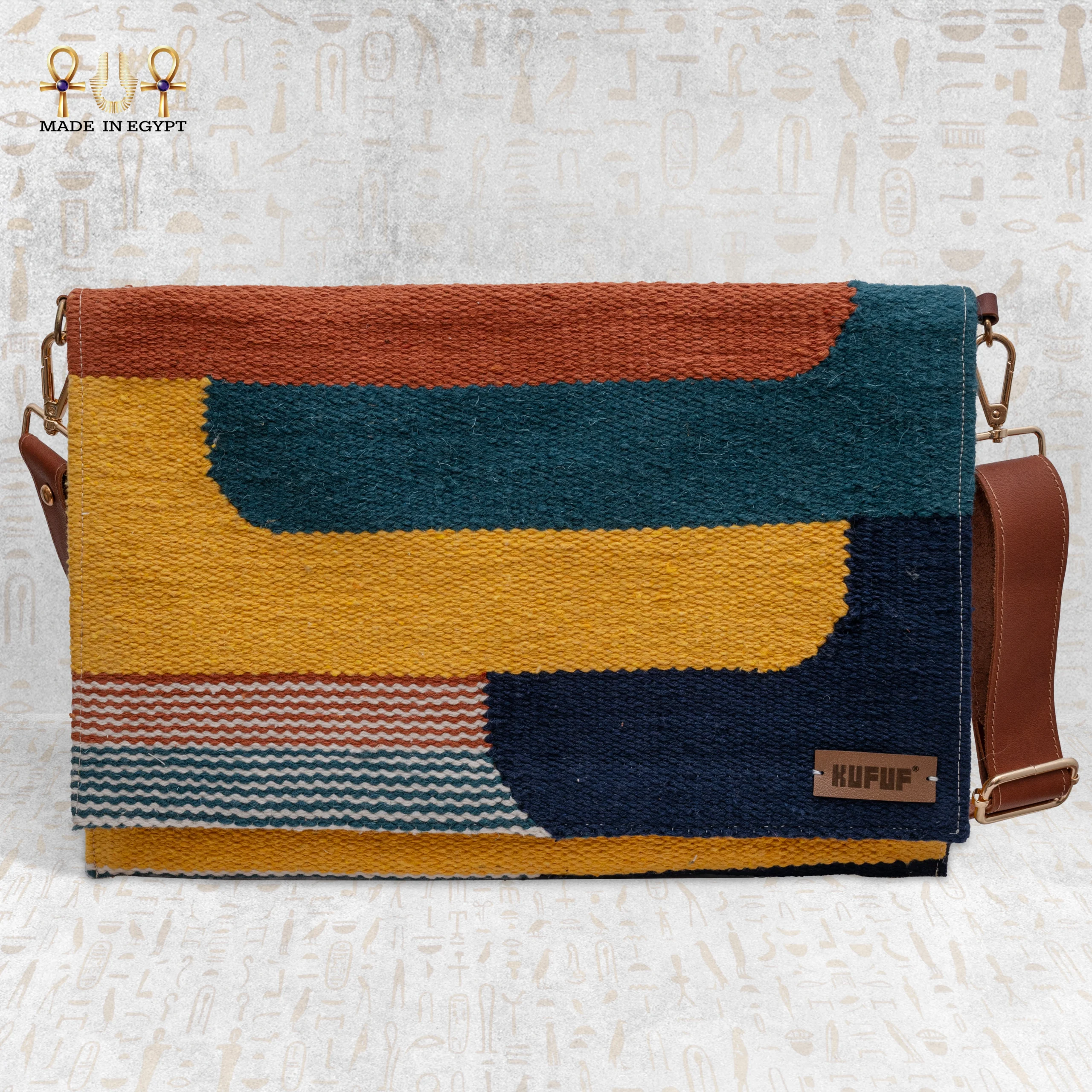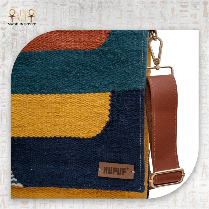 تم تصميم حقيبة نسيم الرمال لتعبّر عن تداخل الألوان الترابية مع ظلال السماء عند الغروب. تجمع بين الأصفر الذهبي، والأزرق الداكن، والنحاسي، والأخضر العميق، في لوحة لونية تنبض بالحياة. التفاصيل الجلدية البنية والإبزيمات الذهبية تضيف لمسة من الفخامة المتقنة، بينما يبرز النسيج القطني المنسوج يدويًا جمال الألوان في انسجام راقٍ يعكس روح الحرفية المصرية الأصيلة.