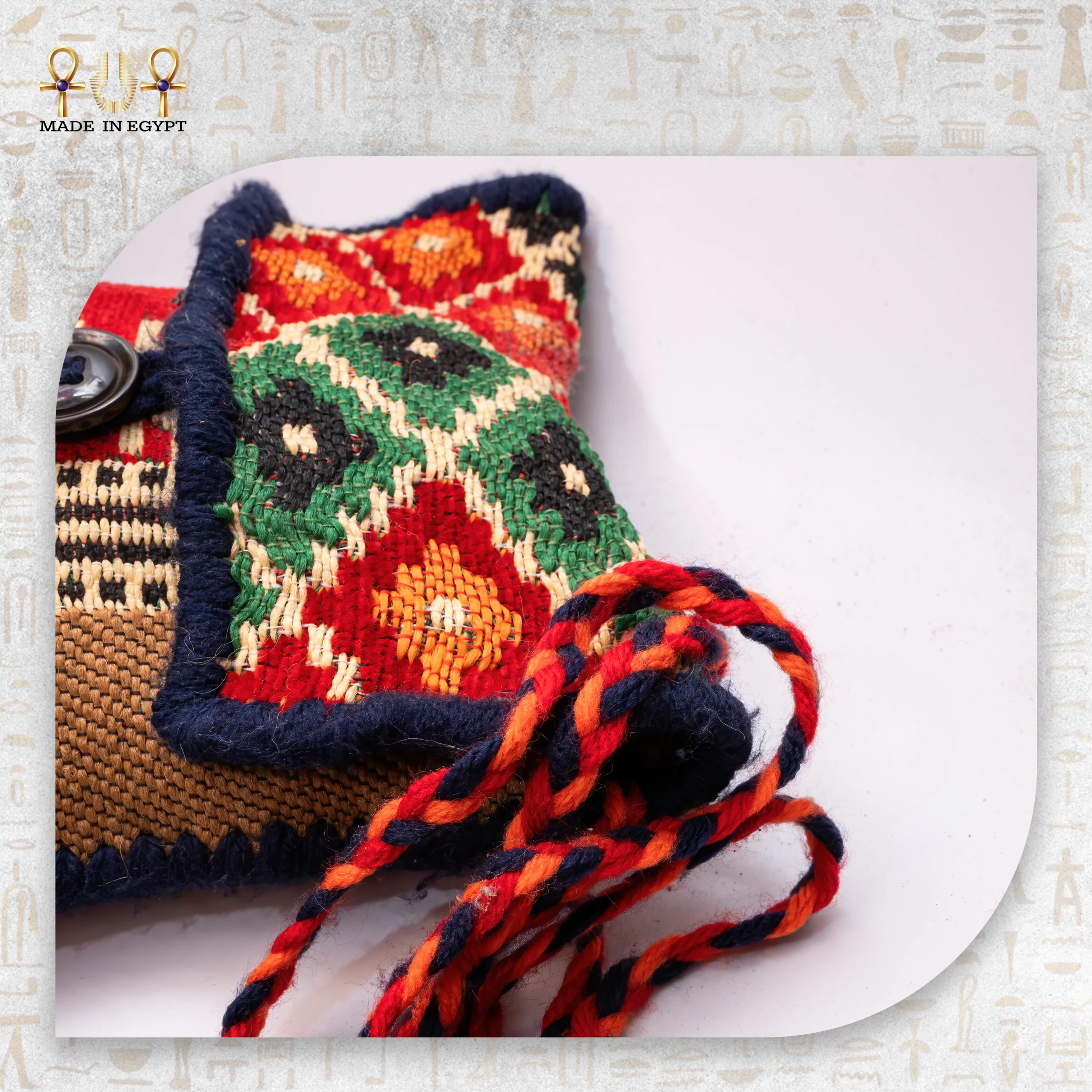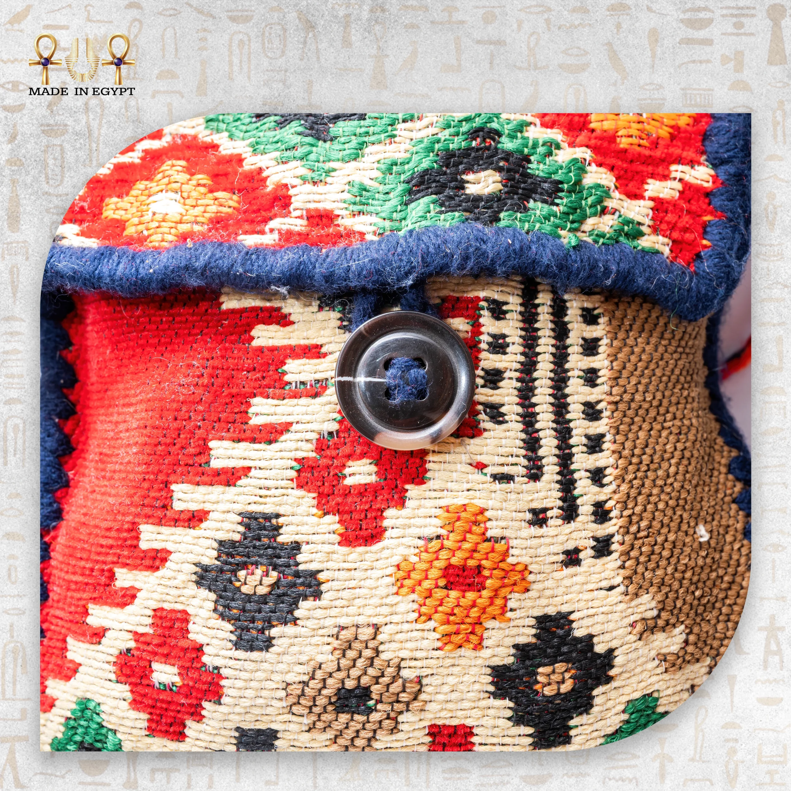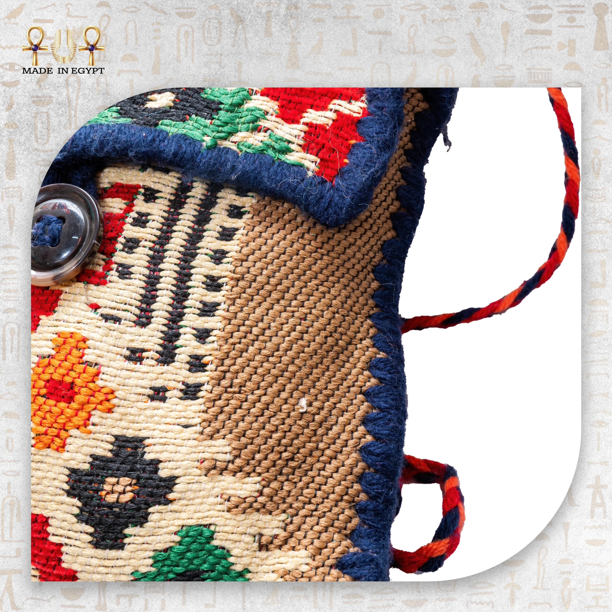 تتميز الشنطة بمزيج ألوان نابض بالحياة من الأحمر، الأخضر، البيج، والأسود، تمتزج بتناغم فني مستوحى من نقوش السجاد العربي التقليدي. حوافها محبوكة بخيوط زرقاء من الصوف تضيف لمسة من الفخامة، بينما يُغلق الجيب الأمامي بزر كبير يمنح التصميم طابعًا ريفيًا أنيقًا. كما تأتي مزودة بحزام طويل من خيوط ملونة يمكن ارتداؤها على الكتف أو ككروس لراحة أكبر أثناء الاستخدام اليومي.