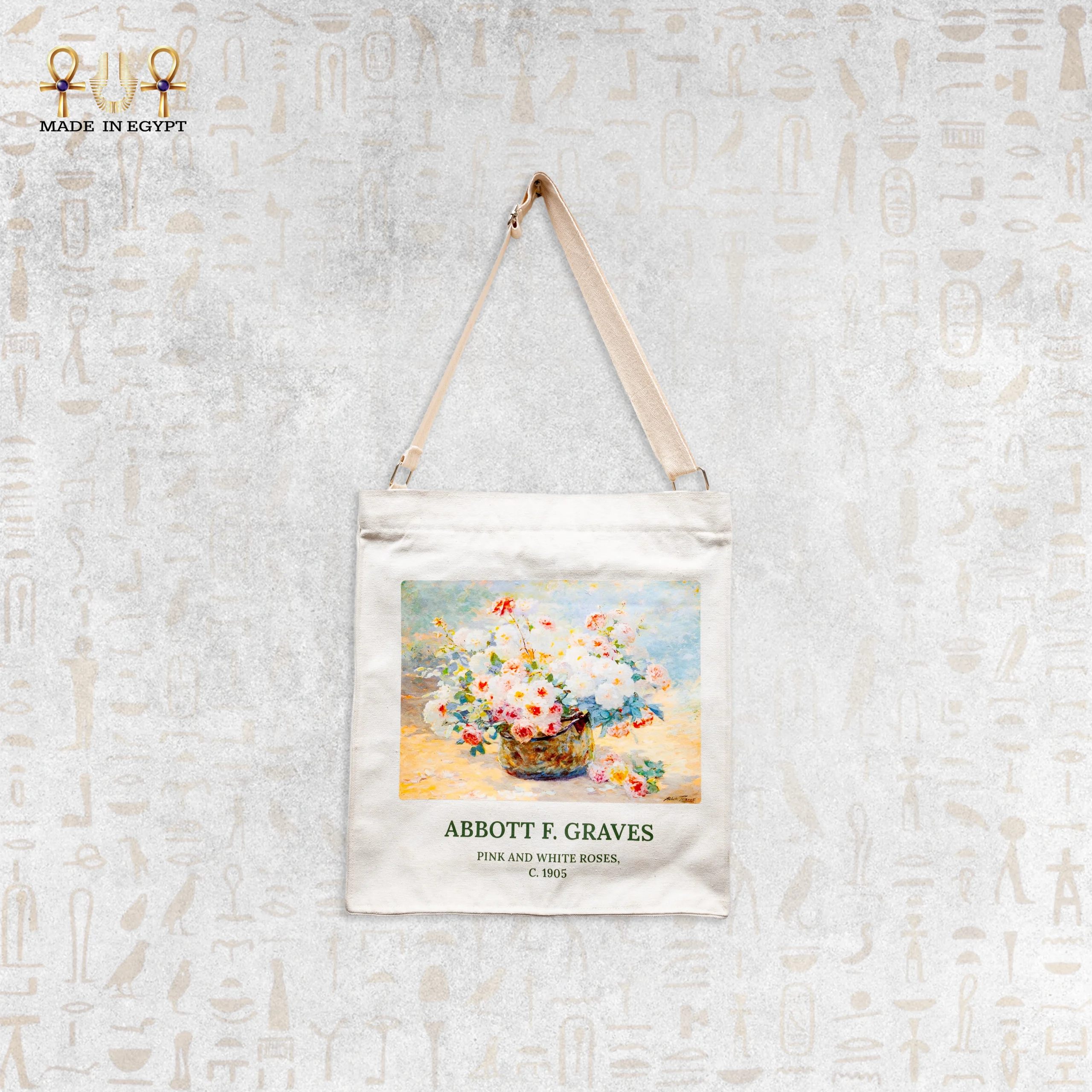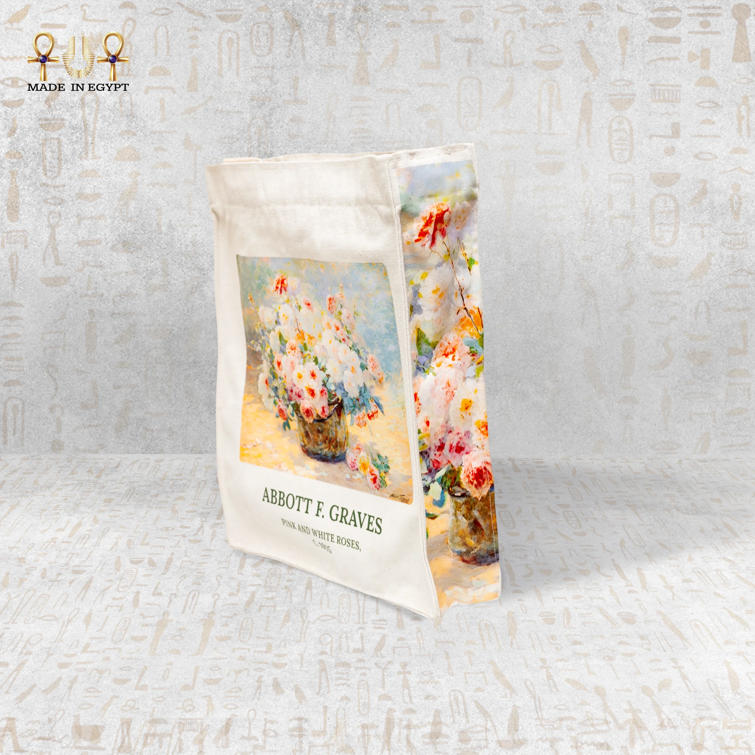 تعكس حقيبة الورود الكلاسيكية الفنية مزيجًا أنيقًا بين الفن الكلاسيكي والتصميم العملي العصري. يستوحي التصميم فكرته من لوحة Pink and White Roses للفنان الأمريكي Abbott F. Graves، وهي من اللوحات التي تجسد جمال الطبيعة بأسلوب فني هادئ ومشرق.
