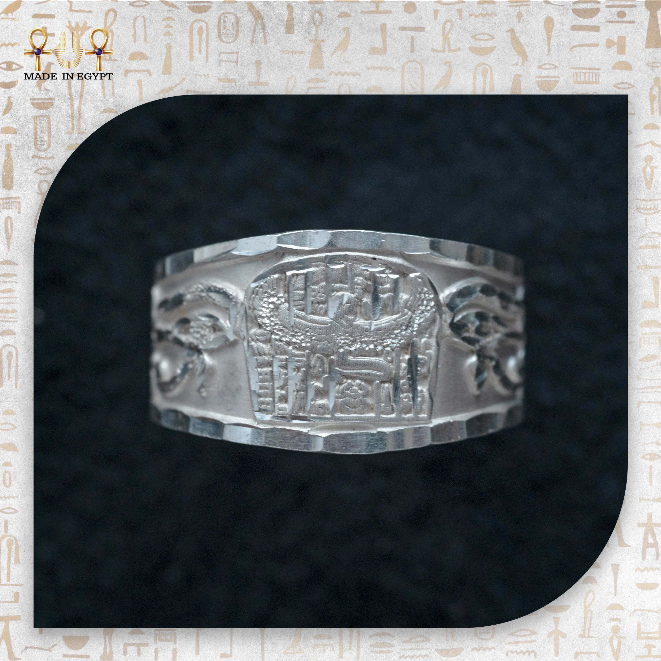 يحتوي الخاتم على رموز مصرية عريقة مثل الكارتوش، زهرة اللوتس، الجُعل، ومفتاح الحياة. هذه الرموز متوازنة لتعطي الخاتم حضورًا آسراً ومعنى يتجاوز البريق.