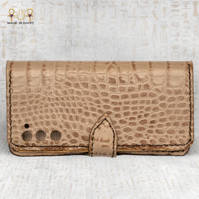 أما الملمس الخارجي، فقد تم رسمه بعناية ليشبه درع التمساح المقدّس. وفي الوقت نفسه، تحكي الدرزات اليدوية قصة ساعات طويلة من العمل المتقن. وبهذا، يخرج المنتج وكأنه قطعة أثرية بروح حديثة، تجمع بين الماضي والحاضر في انسجام فريد.