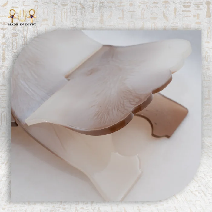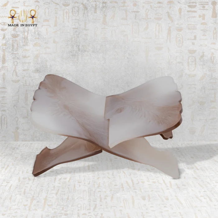 يتميّز التصميم بتفاصيل دقيقة تشبه الأجنحة المفتوحة، ما يدل على السمو والسكينة، وكأن الحامل يحتضن المصحف الشريف برفق وتقدير. بالإضافة إلى ذلك، فقد تم تنفيذ القطعة بطريقة تقليدية تعتمد على الحرفية اليدوية المصرية القديمة، التي اشتهرت بدقتها في التعامل مع المواد الطبيعية وتشكيلها بأناقة لا مثيل لها.