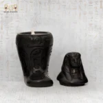 ثم يأتي الغطاء المحفور على هيئة رأس فرعوني ليحوّل الشمعة إلى قطعة تشبه تمثالًا أثريًا صغيرًا. هذا التفصيل يضيف لمسة متحفية واضحة ويجعل الشمعة هدية مثالية لأي محب للتراث المصري.