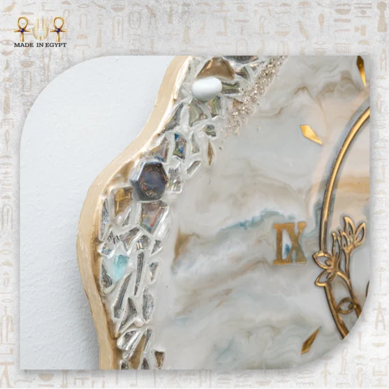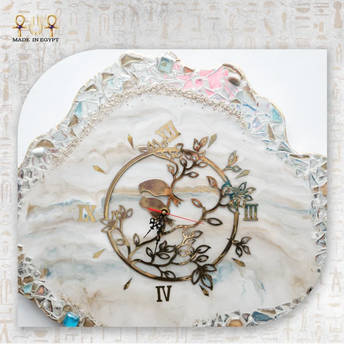 يحيط بالساعة إطار ثلاثي الأبعاد مصنوع من قطع المرايا والكريستال اللامع، والتي تم توزيعها بعناية لإبراز الفخامة دون مبالغة. تعكس هذه القطع الضوء بطريقة ناعمة، مما يخلق بريقًا أنيقًا يلفت الانتباه ويعزز من حضور القطعة داخل المكان. لذلك، تصبح الساعة عنصر ديكور قائم بذاته وليس مجرد أداة لعرض الوقت.