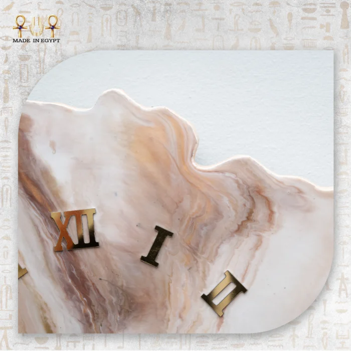 ساعة ريزن رخاميّة بتدرجات بيج وذهبي وفورمة صدفة فنية تضيف أناقة ودفء للمكان.
