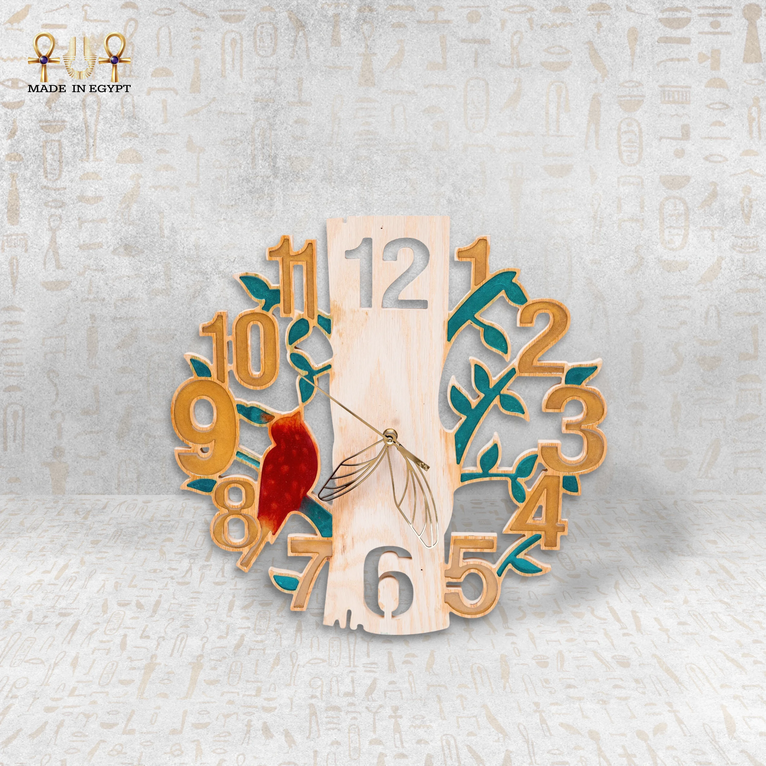 تتميز الساعة بتصميم دائري غير تقليدي، حيث تتداخل الأرقام الخشبية المصنوعة بعناية مع أغصان وأوراق نباتية ملونة، تتوسطها ثمرة رمان بارزة باللون الأحمر العميق، وكأنها قلب نابض داخل العمل الفني. هذا التكوين يمنح الساعة إحساسًا بالحركة والحياة، ويجعلها قطعة لافتة للنظر سواء وُضعت في غرفة المعيشة، غرفة الطعام، المكتب، أو حتى المساحات الفنية والمعارض.