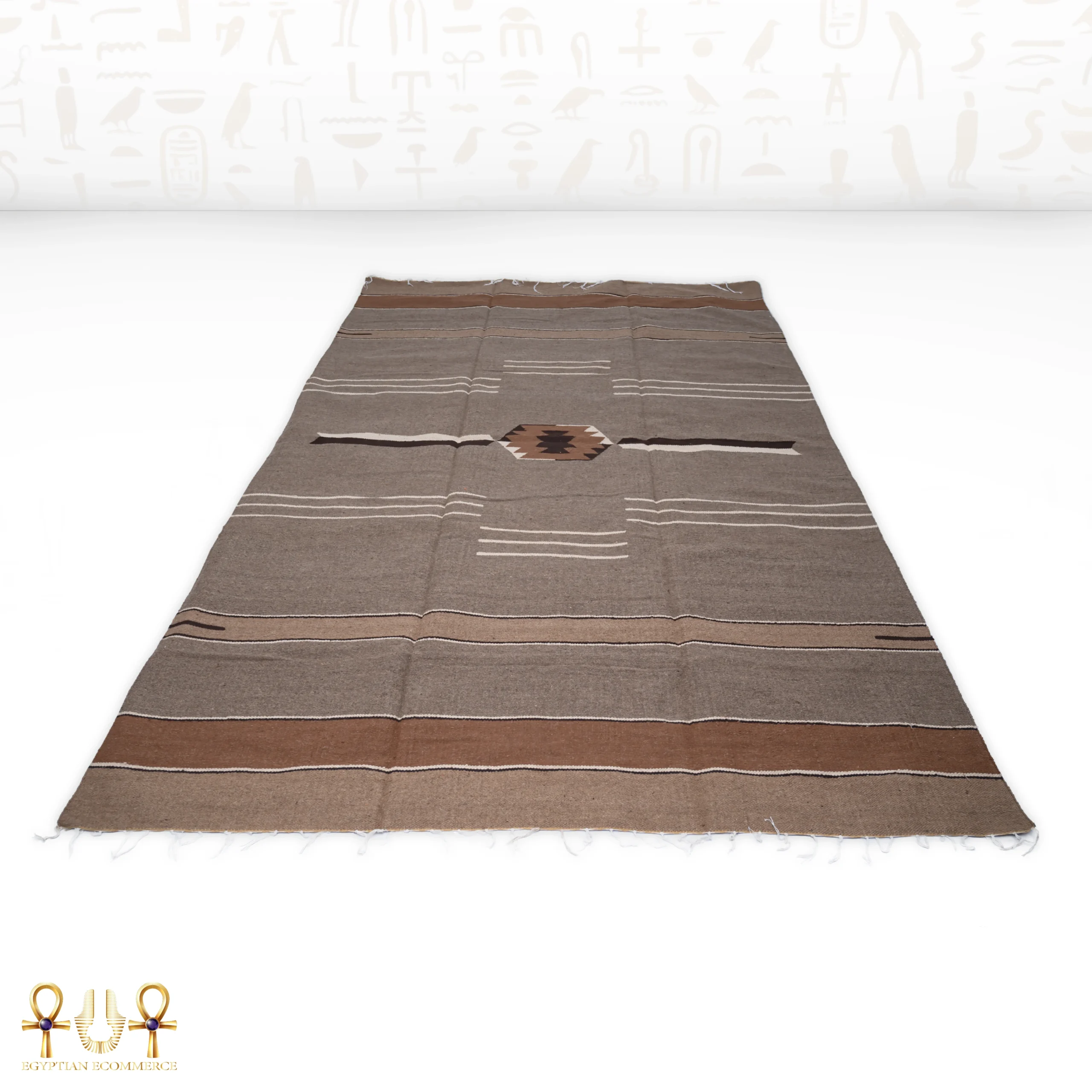 سجادة كليم تراثية مصنوعة يدويًا من الصوف المصري الطبيعي، تجمع بين الأناقة والبساطة بألوانها الترابية الدافئة من البني والأسود والأبيض. تصميمها المستطيل ونقشتها الهندسية الوسطى يضفيان لمسة من الأصالة والدفء على أي مساحة في المنزل، وهي مزدوجة الوجهين لتمنحك جمالًا عمليًا يدوم طويلًا.