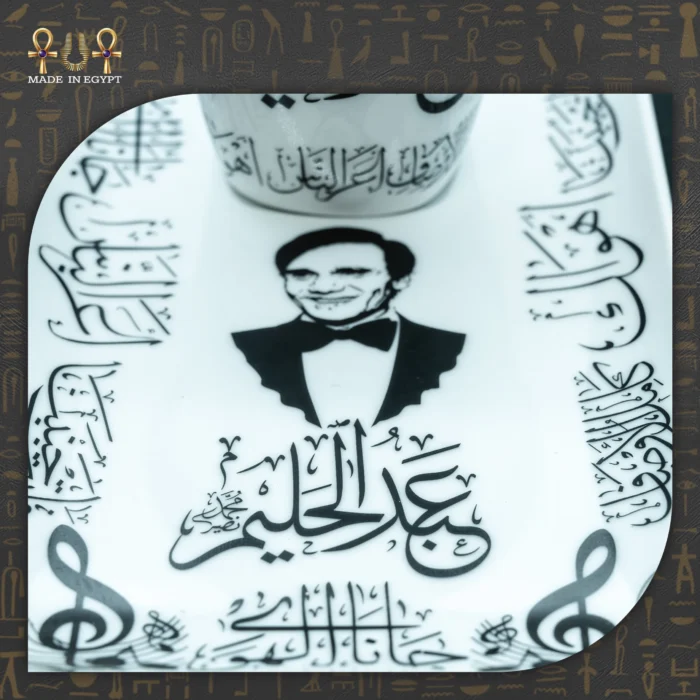 مج بورسلين مزخرف بصورة عبد الحليم حافظ وأغانيه الشهيرة مثل “جانا الهوى” و”أهواك”. تصميم فني يجمع بين الموسيقى والفن العربي.