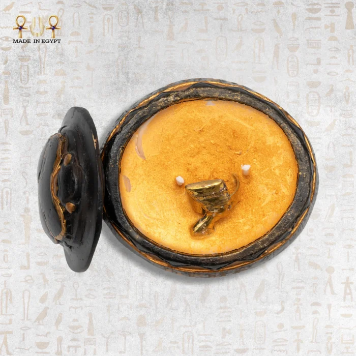 تأتي الشمعة بتصميم دائري يدوي بعناية، مع الجعران البارز على الغطاء. كما تطعم اللونين الأسود والذهبي التصميم، وهما اللونان المرتبطان بالملوك والرموز المقدسة. كل نقش وحافة تحكي قصة من الحضارة المصرية، لتصبح الشمعة ليس مجرد قطعة ديكور، بل تحفة تحكي التاريخ.