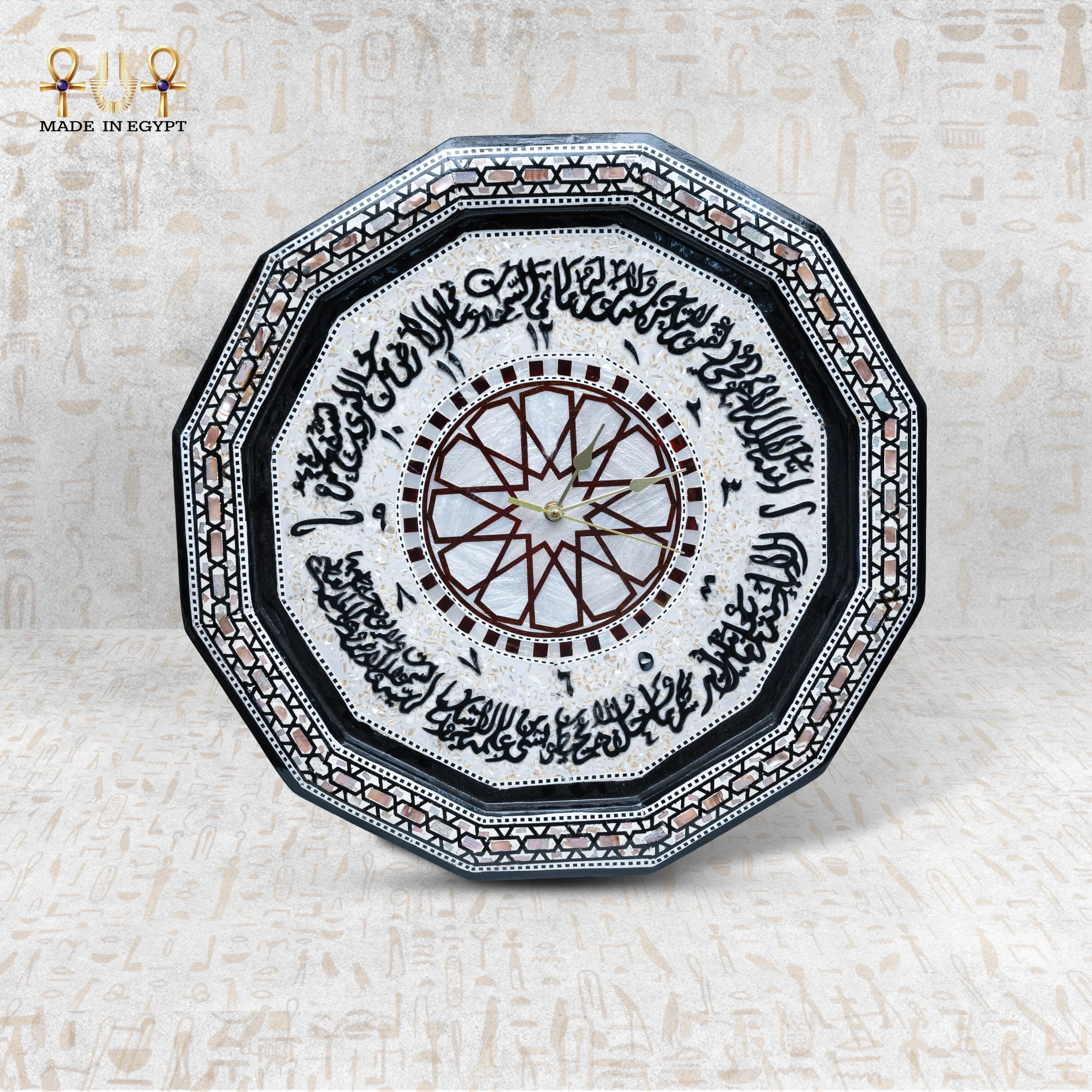 يتوسط الساعة تصميم دائري مميز بخطوط هندسية من الخشب المصقول، يحيط به شريط من الصدف والرصائع الفنية التي تضيف فخامة وعمقًا بصريًا للتصميم. أما الطبقة الوسطى فتتجلى فيها روعة الخط العربي المكتوب بحرفية عالية، حيث يلتف حول دائرة الساعة نصّ مزخرف يمنح القطعة طابعًا روحانيًا وجماليًا ساحرًا.
