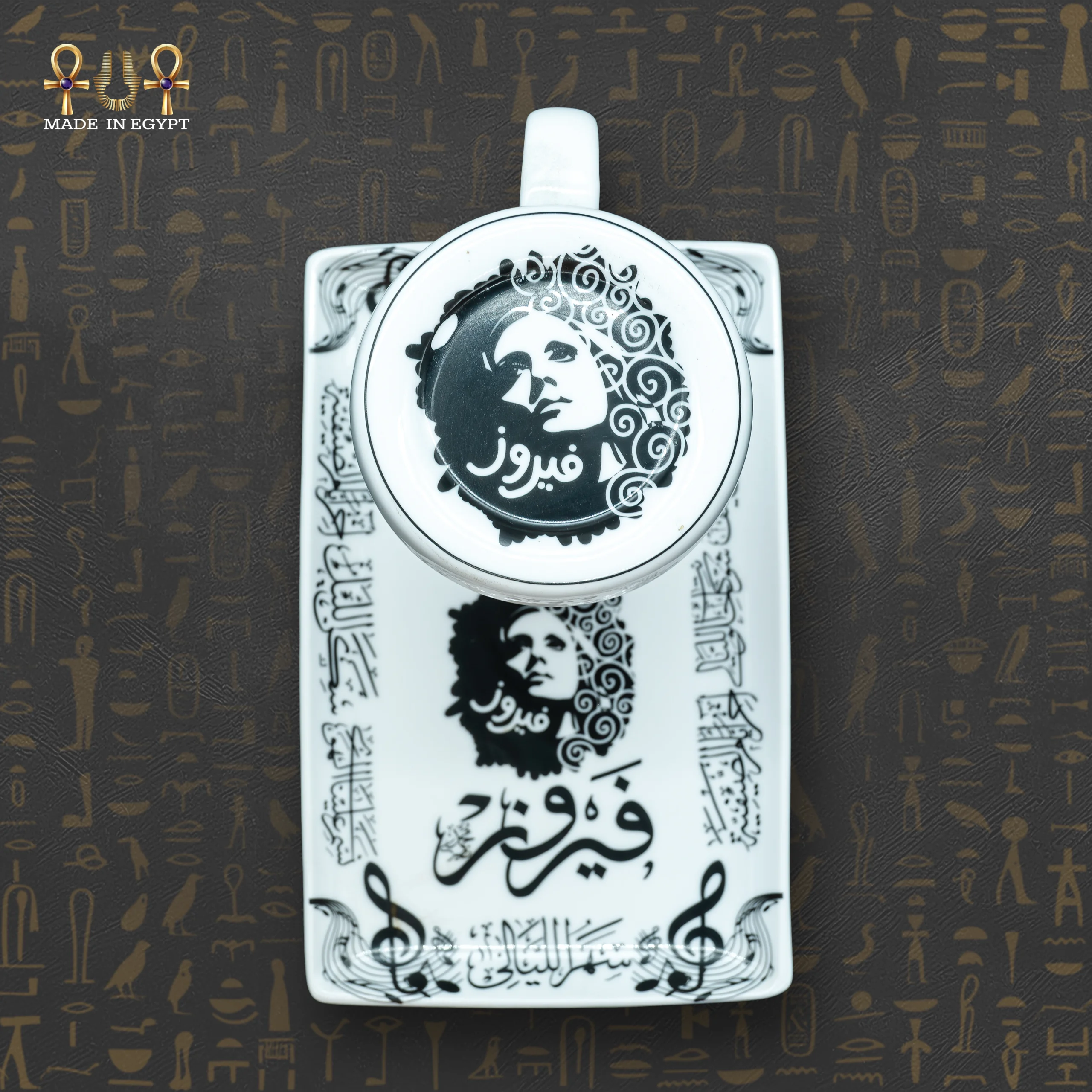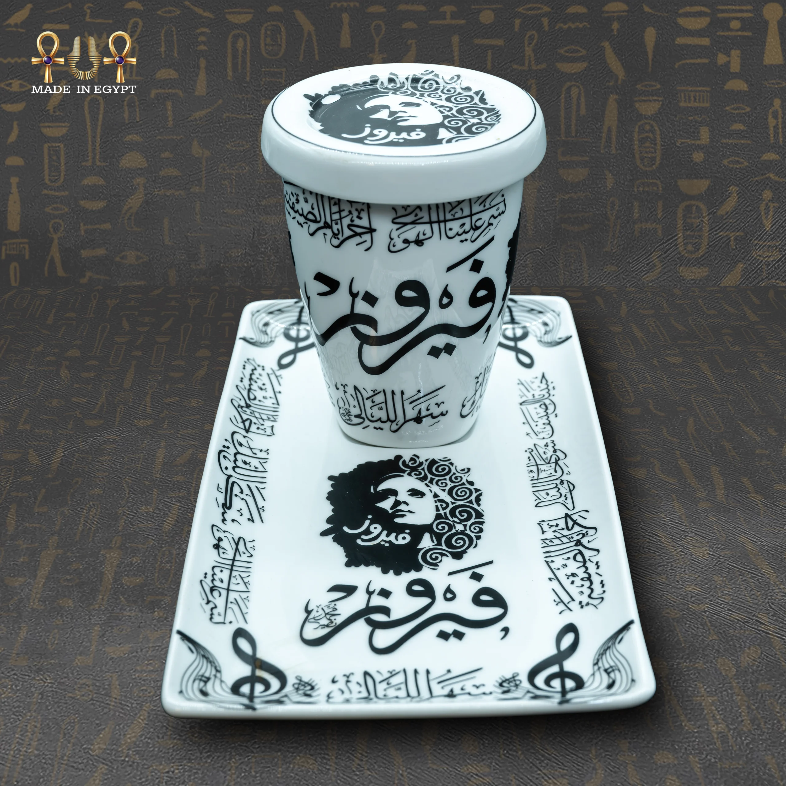 يأتي هذا المج الفاخر مع غطاء بورسلين مميز يحمل صورة الفنانة الأسطورية فيروز، إلى جانب اسمها وأغنيتها الشهيرة “سهر الليالي” مكتوبة بخطوط عربية أنيقة. تم تطبيق طبقة عازلة على المجّ لحماية الطباعة من التقشير، مما يضمن استدامة جمال التصميم لفترة طويلة. الطباعة السوداء على الخلفية البيضاء تمنح المجّ مظهرًا عصريًا وأنيقًا، مع لمسة من الحنين إلى التراث الفني العربي الأصيل.